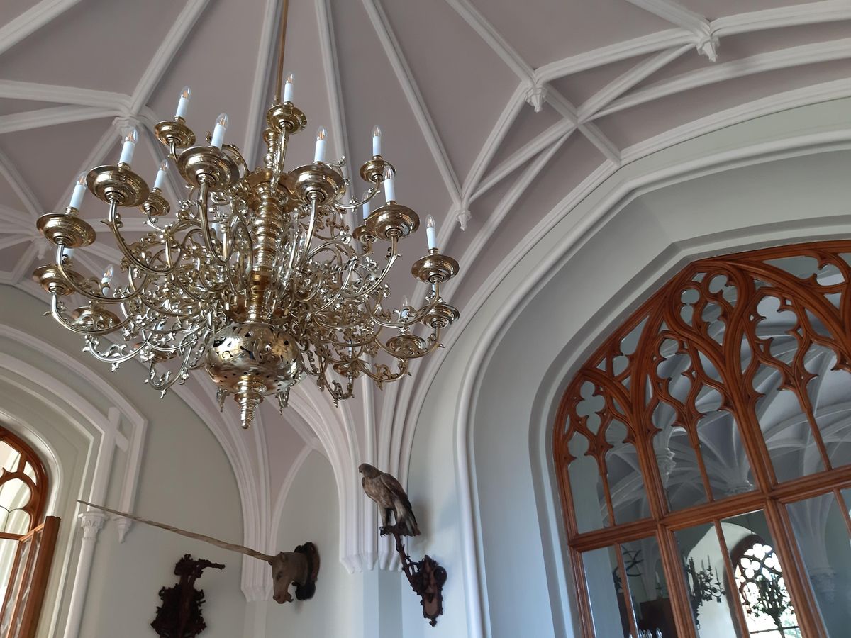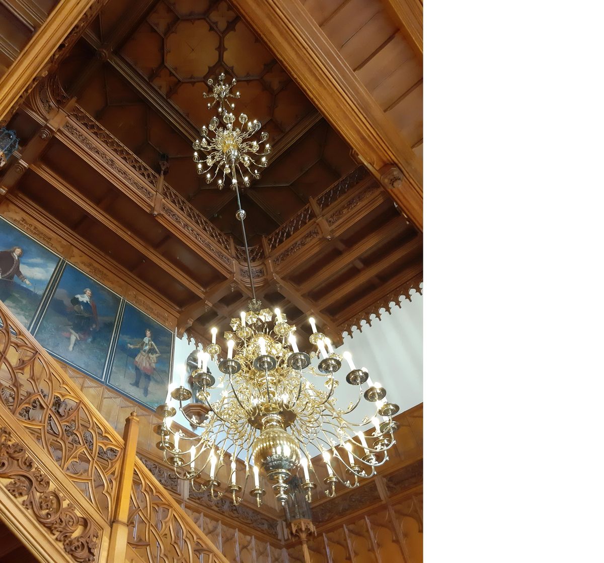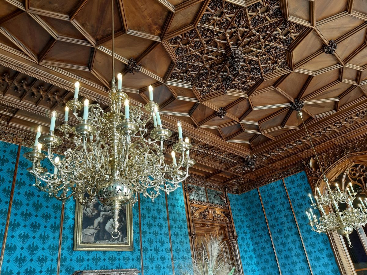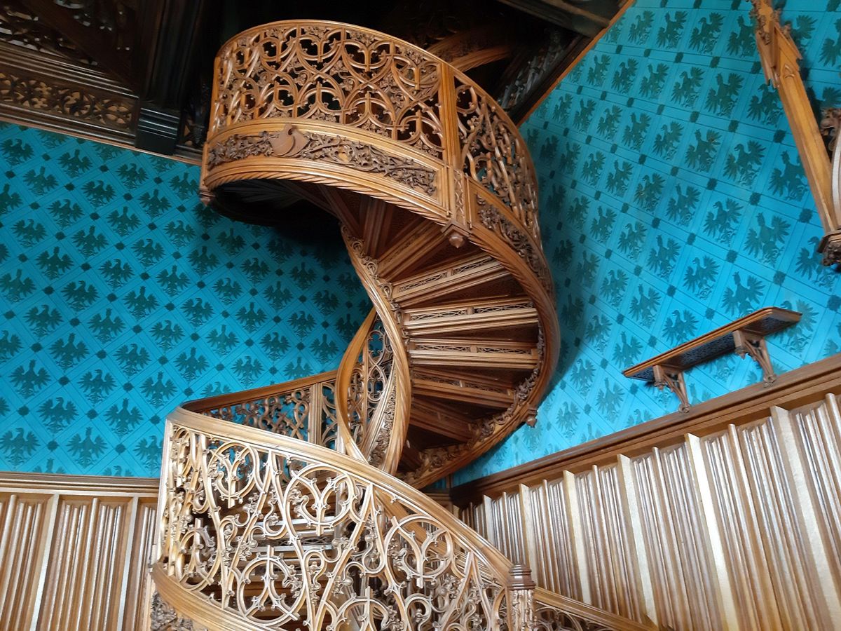 Chodby lemují lovecké trofeje, místnosti jsou známé díky dřevěnému obložení, kazetovým stropům nebo unikátnímu vřetenovému schodišti. Má 36 schodů, přesto je samonosné – na jeho vybudování se nepoužil ani jeden hřebík, což je naprostý unikát. Budete na něj koukat a přemýšlet, jak to tehdejší řemeslníci dokázali.