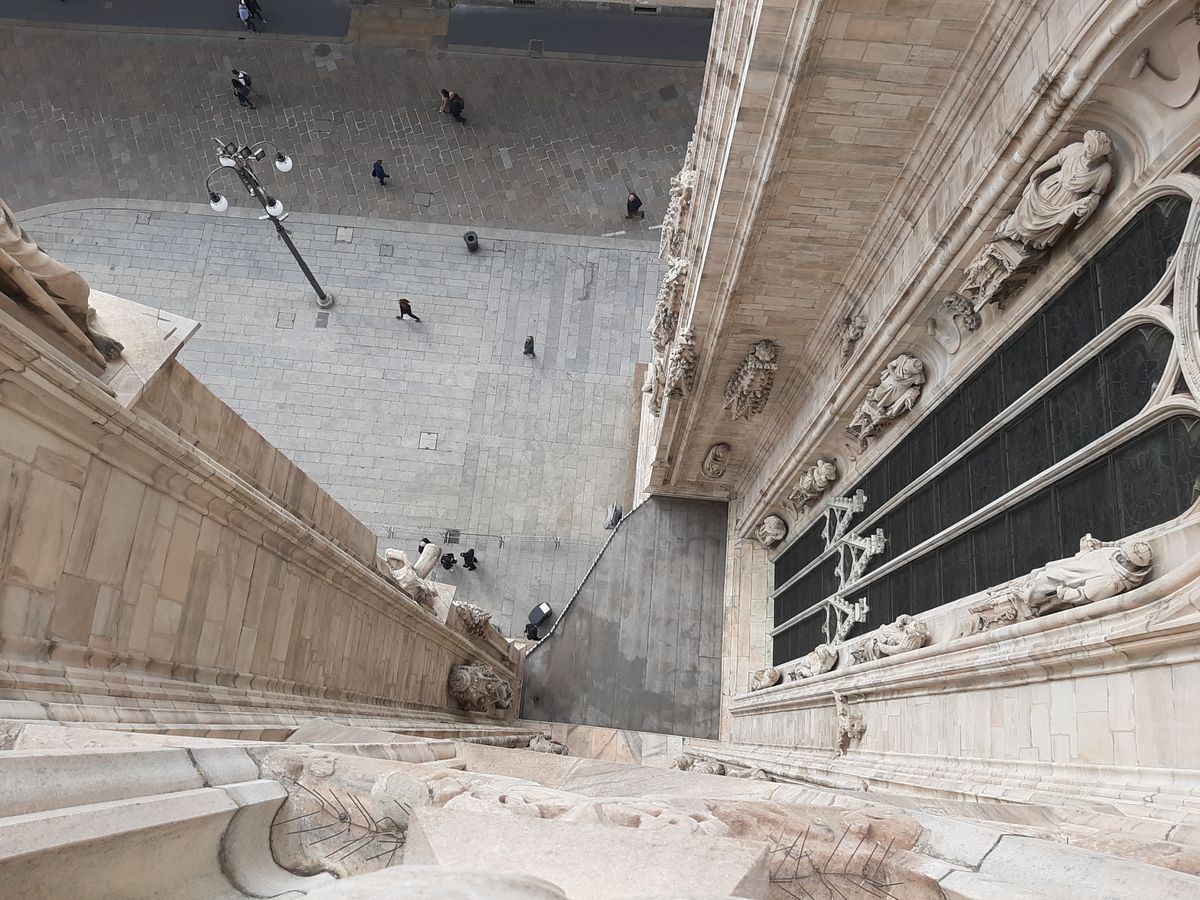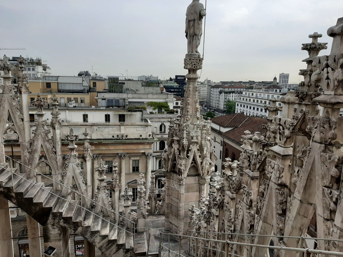 V jedenáct hodin jsme pak začali stoupat na střechu katedrály, kde jsme měli objednanou prohlídku. Zespoda to tak nevypadá, ale na střeše mezi průčelím a arkádami je něco na způsob turistické trasy, takže můžete obdivovat bohatou výzdobu (včetně soch) nebo si vychutnávat pohledy na centrum města. Za každou zatáčkou objevíte něco jiného, ale ti, kteří trpí závratěmi, by se raději neměli dívat dolů.