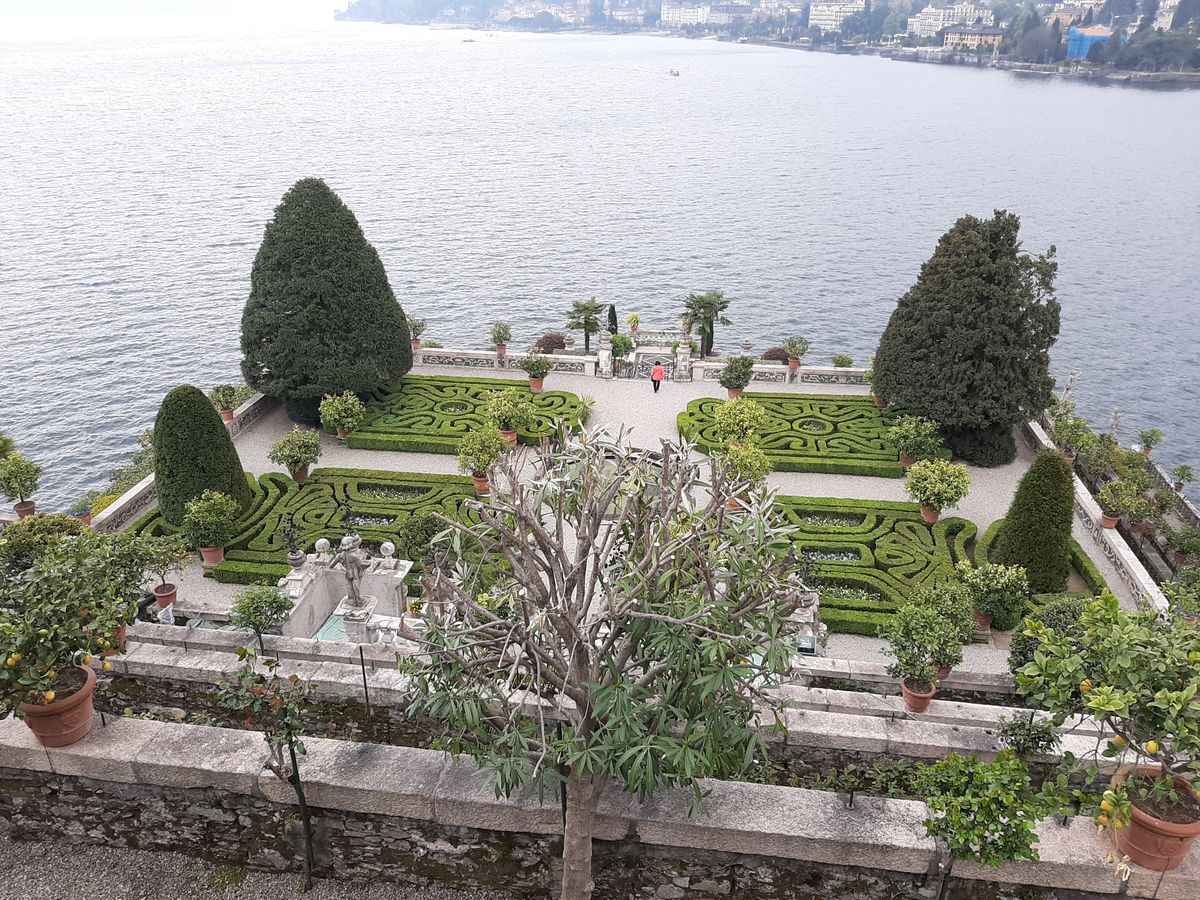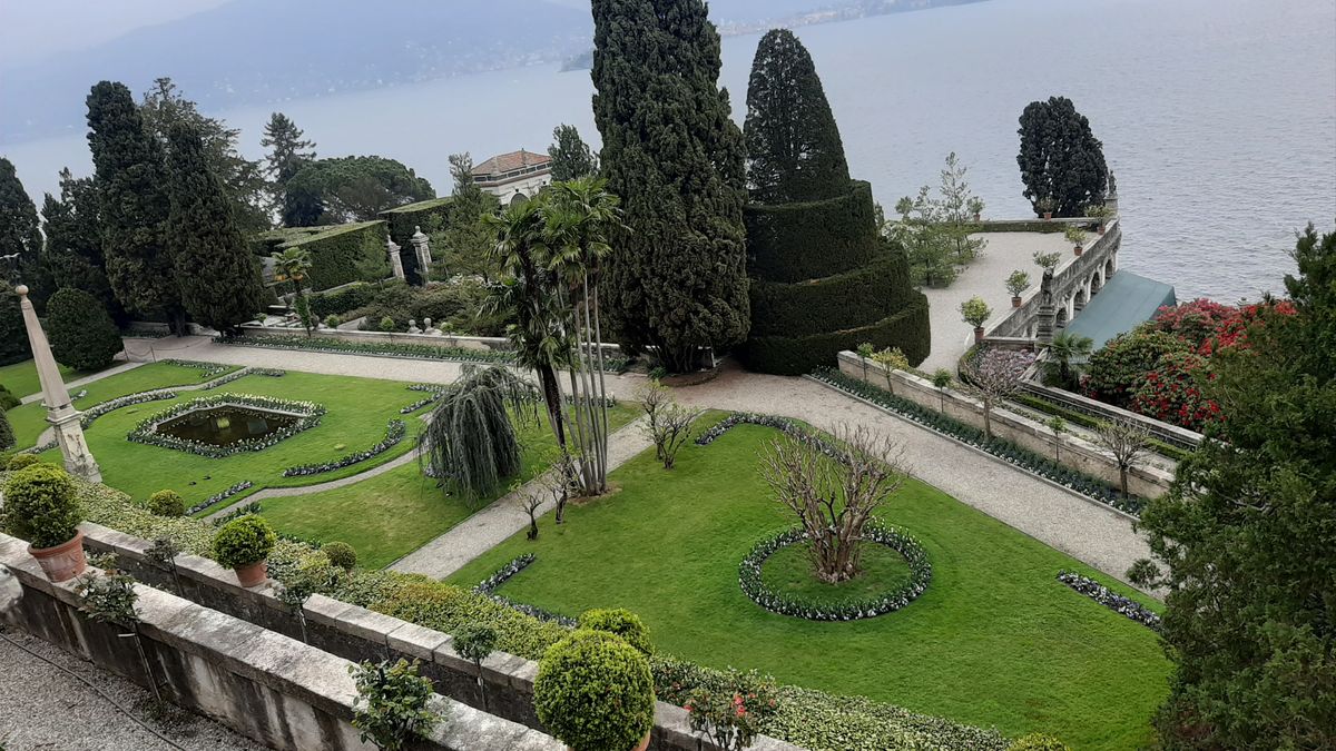 Kolem paláce jsou vystavěné překrásné zahrady v italském stylu, v nichž najdete nepočet schodišť, fontán, soch a samozřejmě rostlin. Řada z nich spadá mezi exotické druhy, mezi ty nejvzácnější patří magnólie, citrusy nebo kamélie. Ze zahrad jsou při dobrém počasí úchvatné výhledy na jezero, respektive na další ostrovy. V zahradách potkáte i relativně vzácné bílé pávy.
