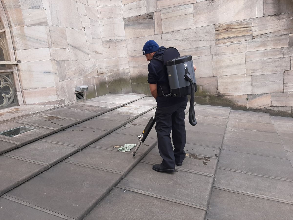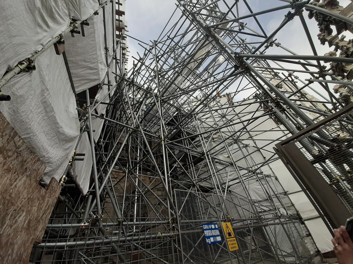 A finální skladba lešení hodně připomínala jeden velký chaos. Na střeše jsme potkali i místního údržbáře, který nesl na zádech průmyslový podtlakový vysavač pro čištění povrchu katedrály.