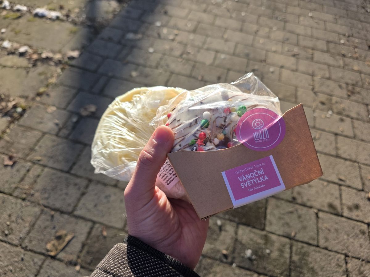 Samozřejmě i zde najdete stánky s občerstvením, punčem, sýrovými specialitami a svůj stánek zde má i Růžová cukrárna, která okouzlila naši dceru – bez donutu neodešla.