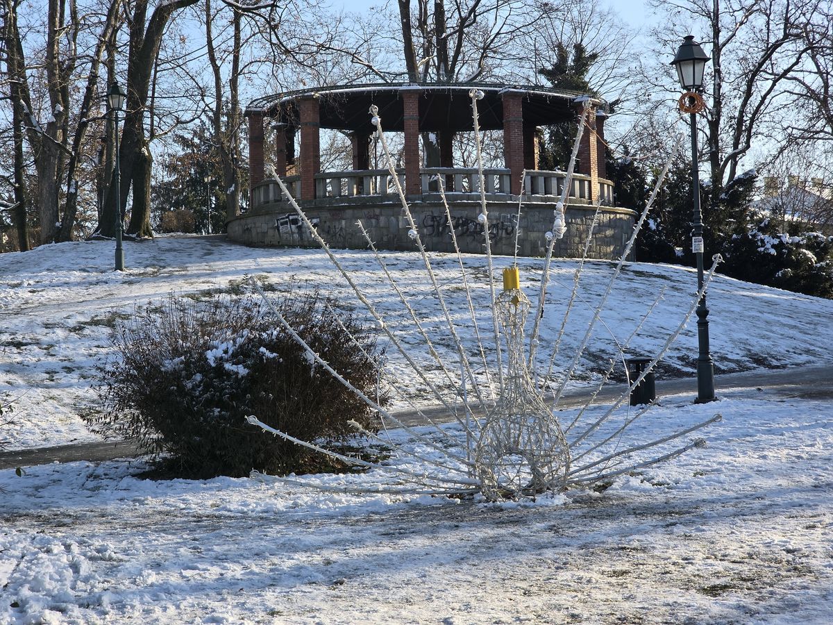 U Ptačího vrchu je postavena světelná brána a ze světýlek i páv. O kousek dál před Obecním domem najdete první stánky s občerstvením a punčem a stylové dekorace v příjemném prostředí parku.