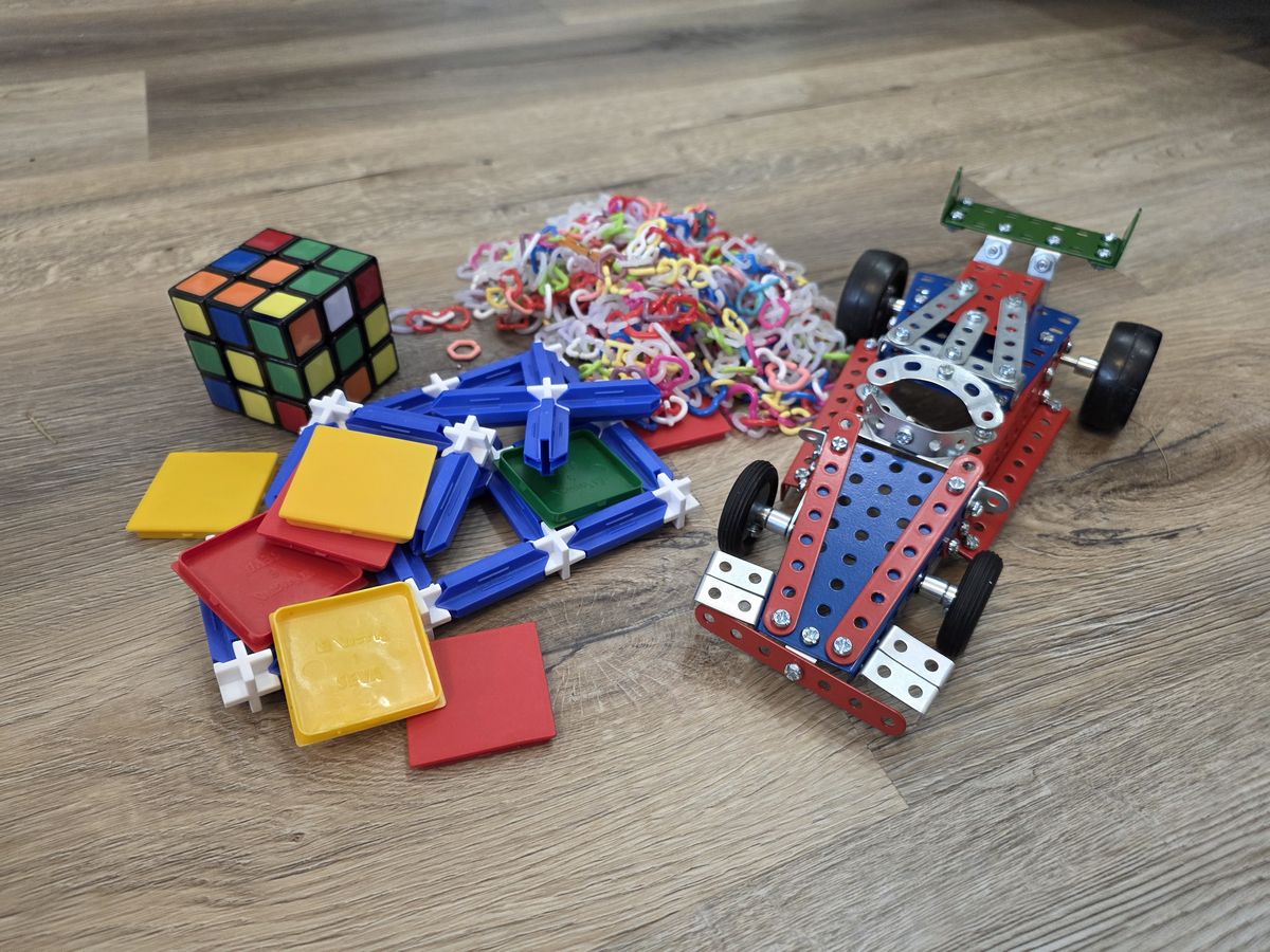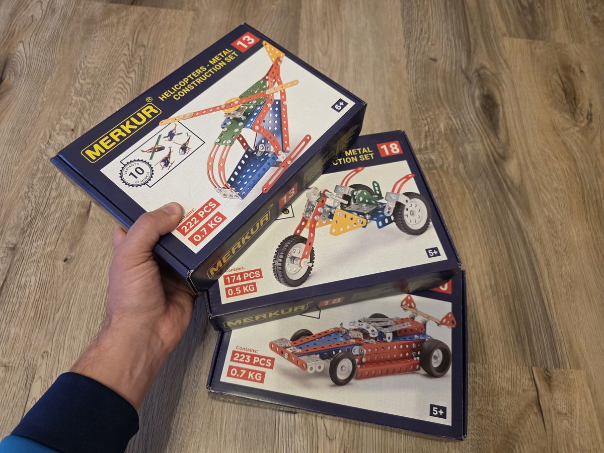 Merkur má stavebnice od úplně nejmenších až po profesionály. Složíte z něj cokoliv, od dinosaura až po kombajn. Ty největší stavebnice jsou za několik tisíc, ty běžnější stojí pár stovek. Dětem jsme pořídili tři stavebnice – vtulník, formuli a motorku, které se dají podle návodu přeskládat do různých dalších podob.