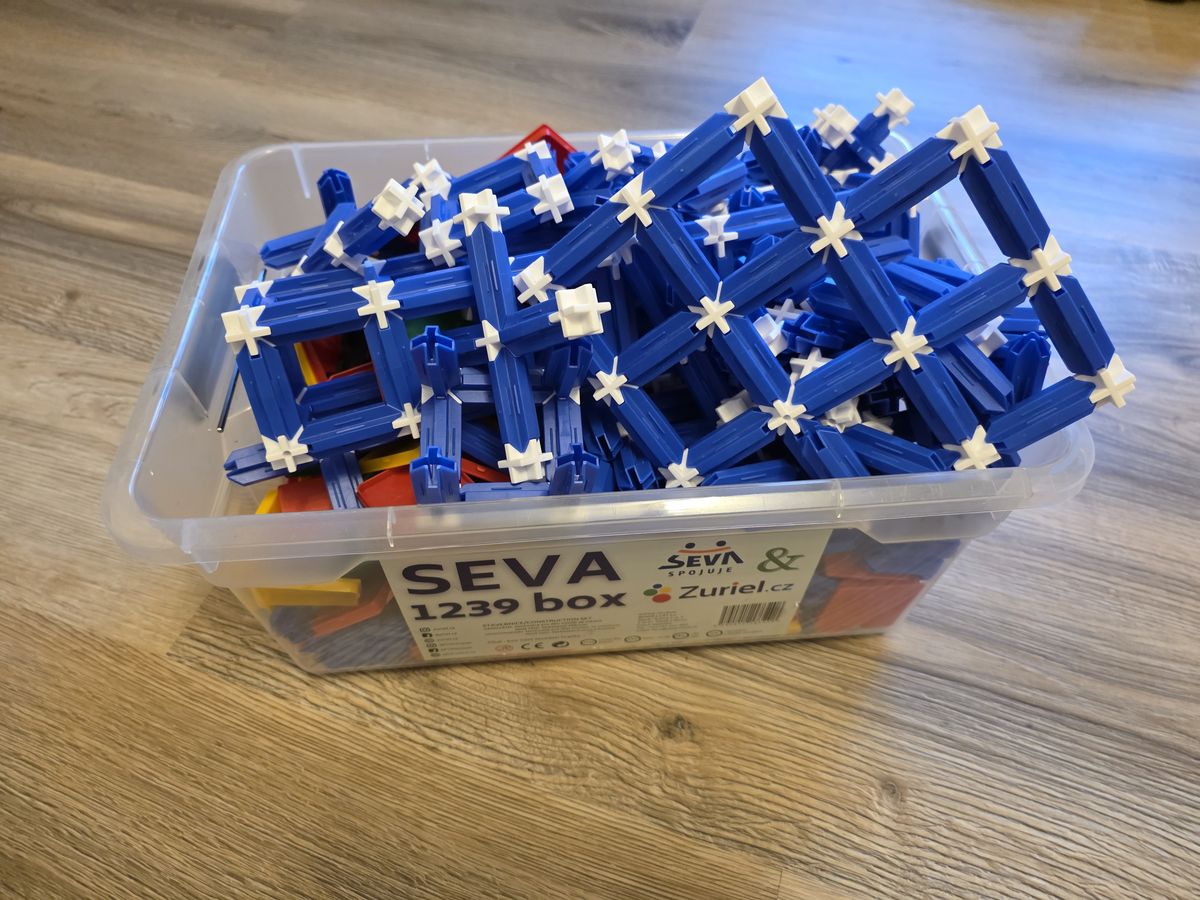Když jsem dětem ukázal Sevu, okamžitě ji chtěly mít. Proč? Protože ji mají a měly ve školce. Základem jsou modré plastové dílky s výlisky a bílé spojovací kříže. Čtvercové konstrukce můžete vyplnit barevnými destičkami, navíc jsou k dispozici kola, jeřáby, hřídele a další speciální díly.