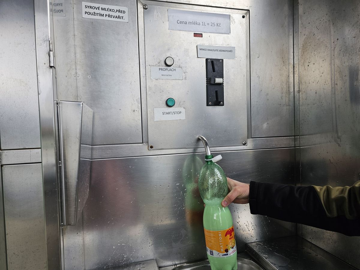 Cena mléka je 25 Kč za litr a takové mléko jsme ještě nepili – plná nasládlá chuť, nejen bíle zabarvená voda, kterou koupíte v obchodě. Na mlékomatu najdete i doporučení, že si máte mléko převařit. Pro mléko si zde dojela na kole i starší paní z obce a další turisté, jistě se zde zastavte, stojí to za to.