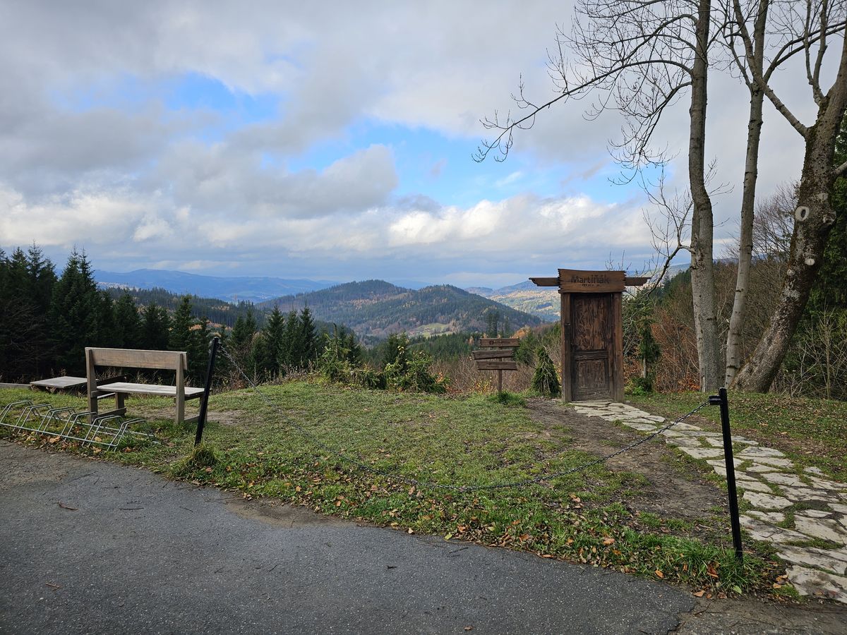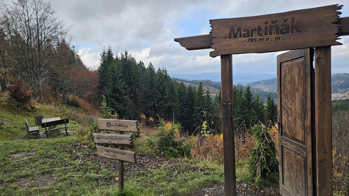 První krásné výhledy se nám naskytly na rozcestí Bařiny, odkud už to bylo jen půl kilometru k hotelu Martiňák. Před hotelem se nachází dětské hřiště, posezení k odpočinku i stylové dřevěné dveře s výhledy do beskydské krajiny.
