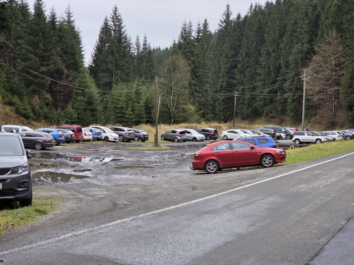 Vybrali jsme tedy trasu z Podolánek k horskému hotelu Martiňák. Parkoviště je nedaleko autobusové zastávky Podolánky škola a nebylo v příliš dobrém stavu. Po dešti zde byly obří krátery vyplněné vodou a všude spousta bahna, nicméně je zde dostatek míst k parkování, takže jsme zde své auto nakonec také nechali.