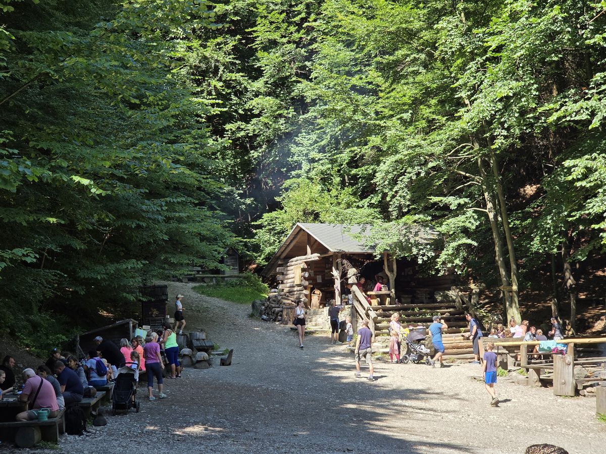 Před stoupáním si můžete vypůjčit i hole pro Nordic walking zavěšené na stromě u křižovatky spolu s kasičkou. Asi po 1,5 km dorazíte do cíle, kde na vás čeká řada nápojů chlazených vodou z horského potůčku, nějaké drobné sladkosti a máte možnost si zde opéct špekáček nebo klobásu.