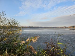 Nedaleko parkoviště jsme si odlovili kešku a vydali se podívat na druhou stranu od parkoviště. Po cestě jsme minuli dřevěné posezení k odpočinku a už z mostu jsme viděli rozlehlé Hlučínské jezero.