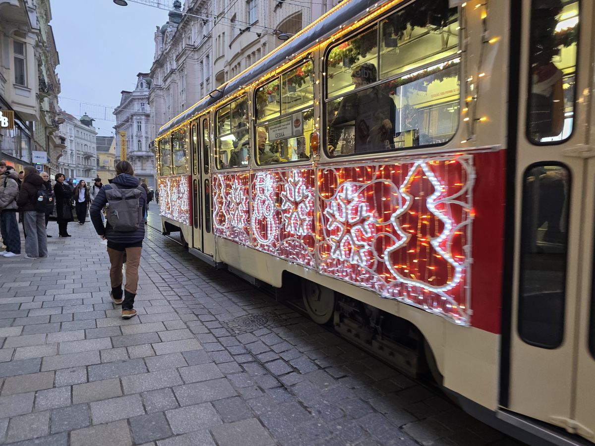 Centrem projíždí vánoční express i nazdobená vánoční šalina (tramvaj) v rámci okružní linky Malinovského náměstí – Česká.