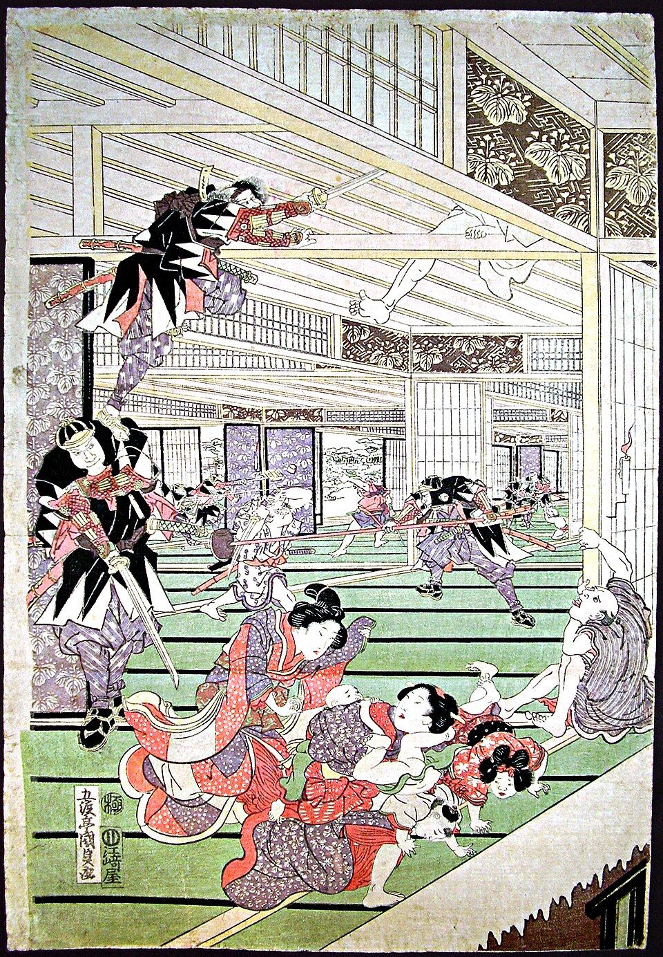 47 róninů útočí na sídlo pána Kiry. Autor: Utagawa Kunisada (1786–1865) (public domain)