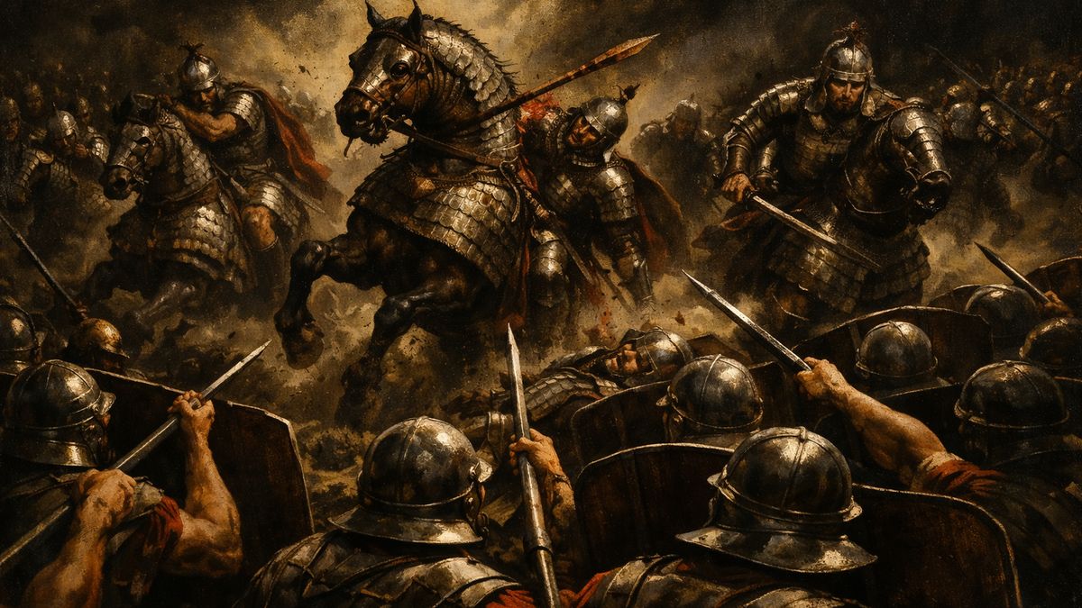Ještě než slunce vystoupí nad obzor, visí nad planinou tíživé ticho. Vítr zvedá prach a žene jej mezi řadami římských legionářů. Muži stojí těsně u sebe, štíty opřené, přilby ztemnělé potem. Jsou unavení dlouhým pochodem, ale jejich formace je pevná. Nikdo nemluví. Všichni vědí, že není kam ustoupit.