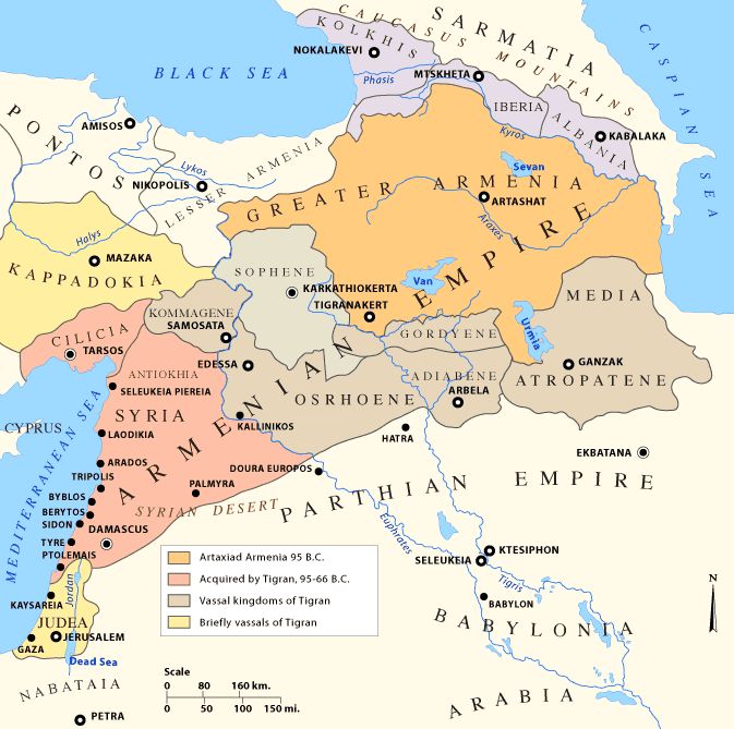 Mapa Arménské říše za vlády Tigranése (95–66 př. n. l.). Autor: Robert H. Hewsen, Armenia: A Historical Atlas / Wikimedia Commons. Licence GFDL.