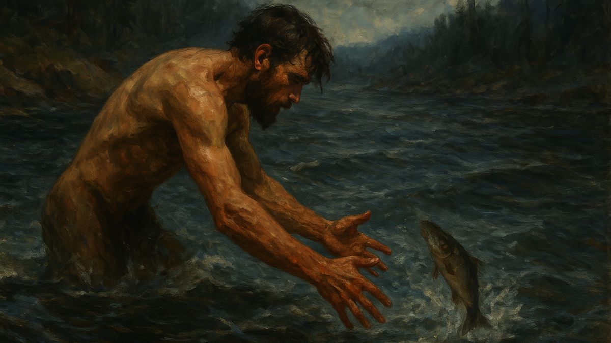 „Stál jsem po pás v ledové vodě. Snažil jsem se stát nehybně jako kámen. Když se losos přiblížil, trhl jsem rukama. Nechytil jsem ho. Až na šestý pokus.“