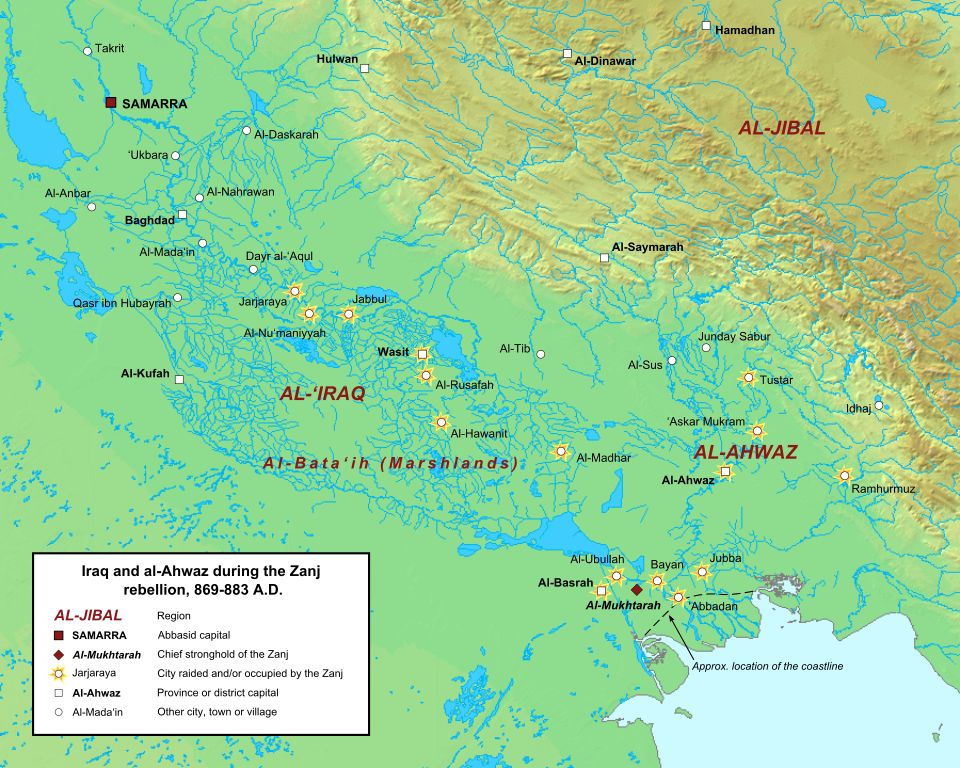 Mapa povstání Zandžů v Abbásovském chalífátu (nyní jižní Irák) v letech 869–883. Zvýrazněná města byla Zandži obsazena nebo vypleněna.