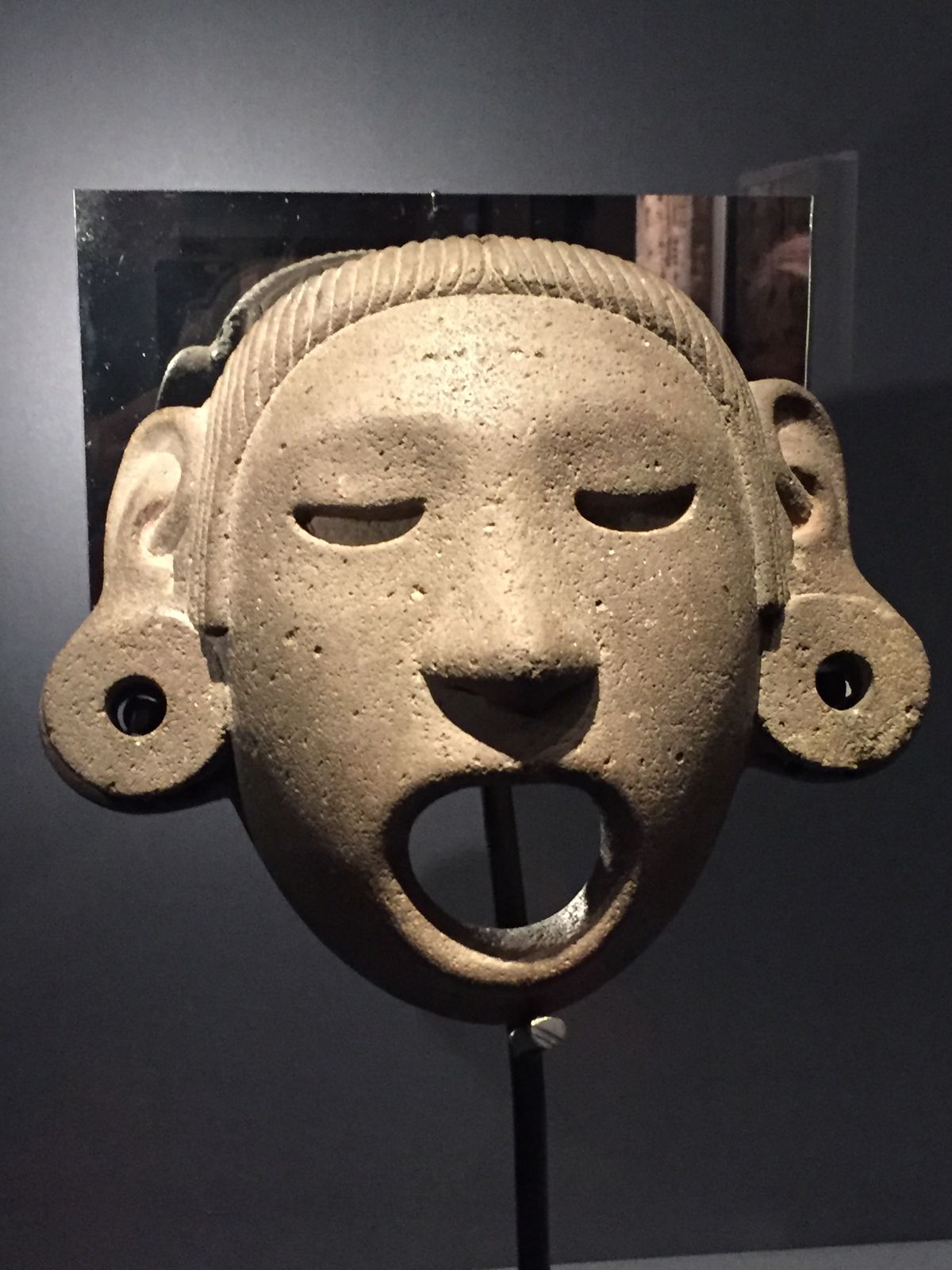 Šedá maska z vulkanického kamene zobrazující aztéckého boha Xipe Toteca (asi 1400–1521).