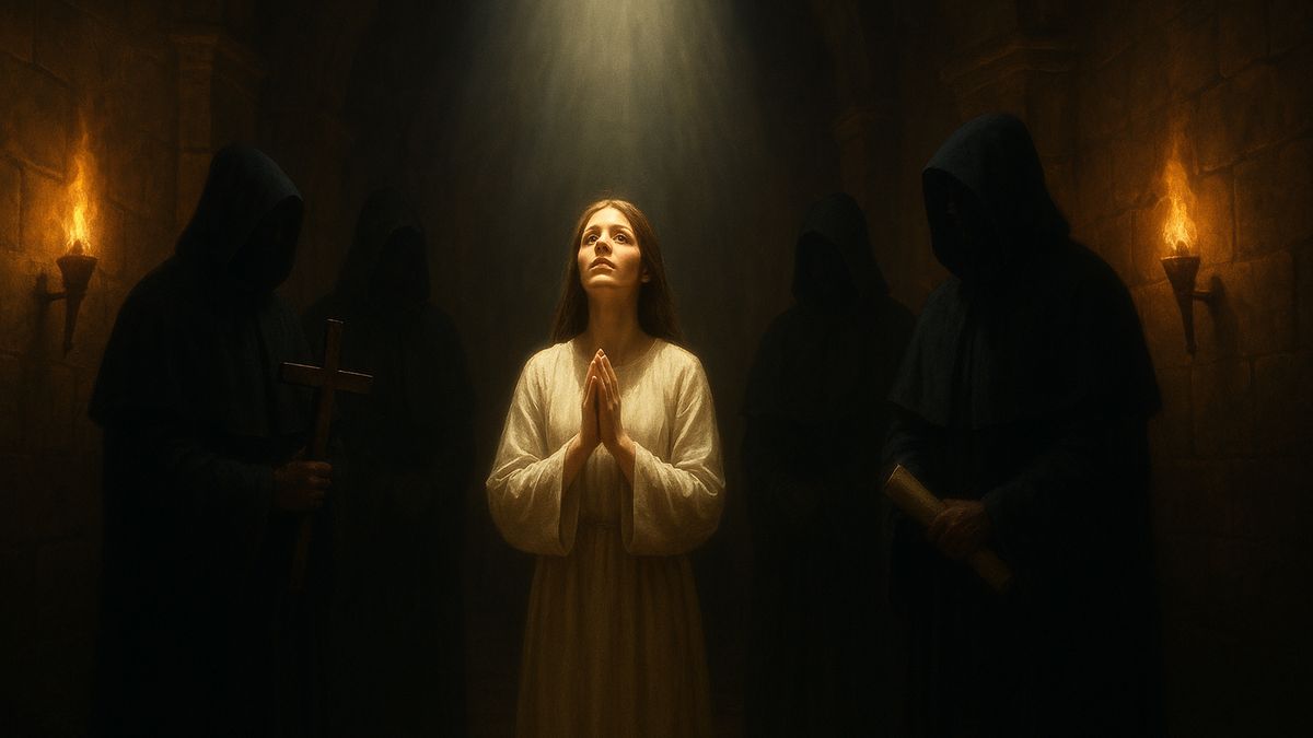Inkvizitor před ní stál v tiché, ledové převaze. V černé kápí, s tváří napůl zahalenou stínem. V jedné ruce krucifix, v druhé pergamen s protokolem.