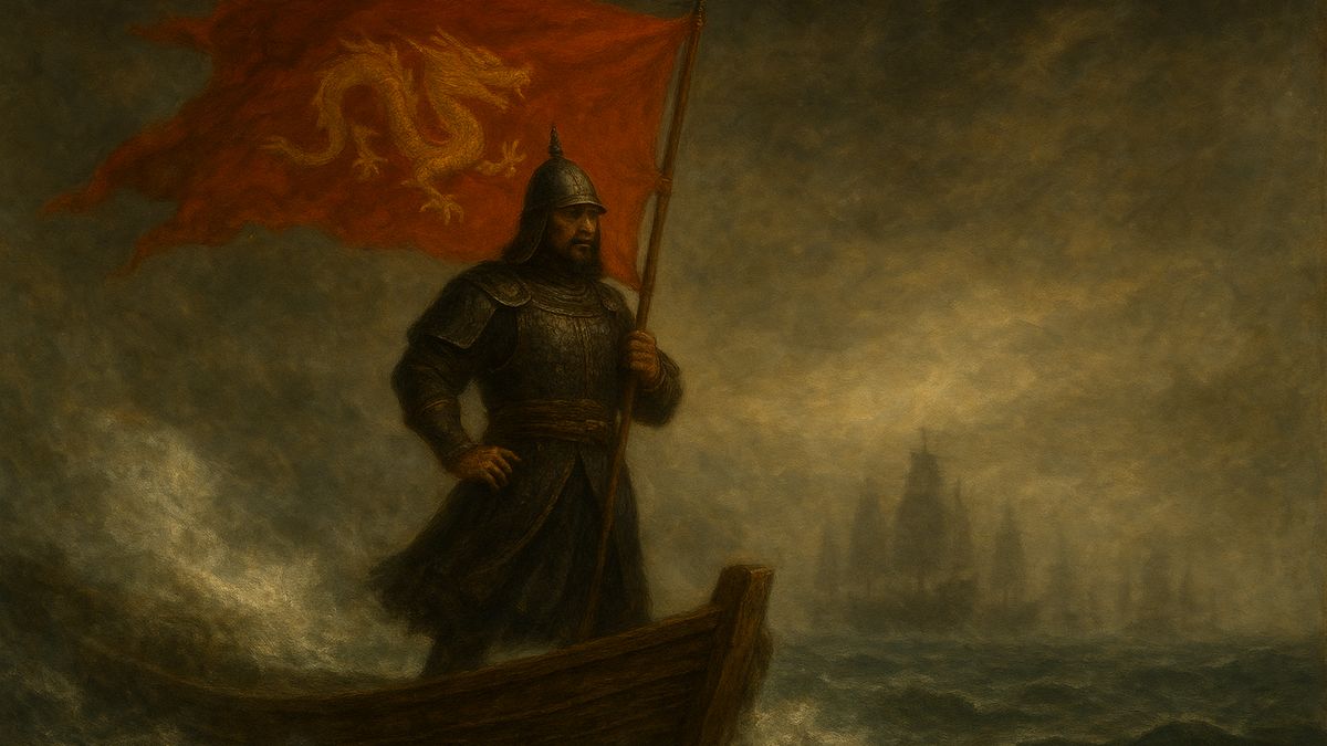Yi přesto mlčel. Pak zvedl bambusovou tyč s královským praporem, přivázal ji k zábradlí a nechal vlajku vlát po větru. Znamení, že velitel neopustí svou loď.