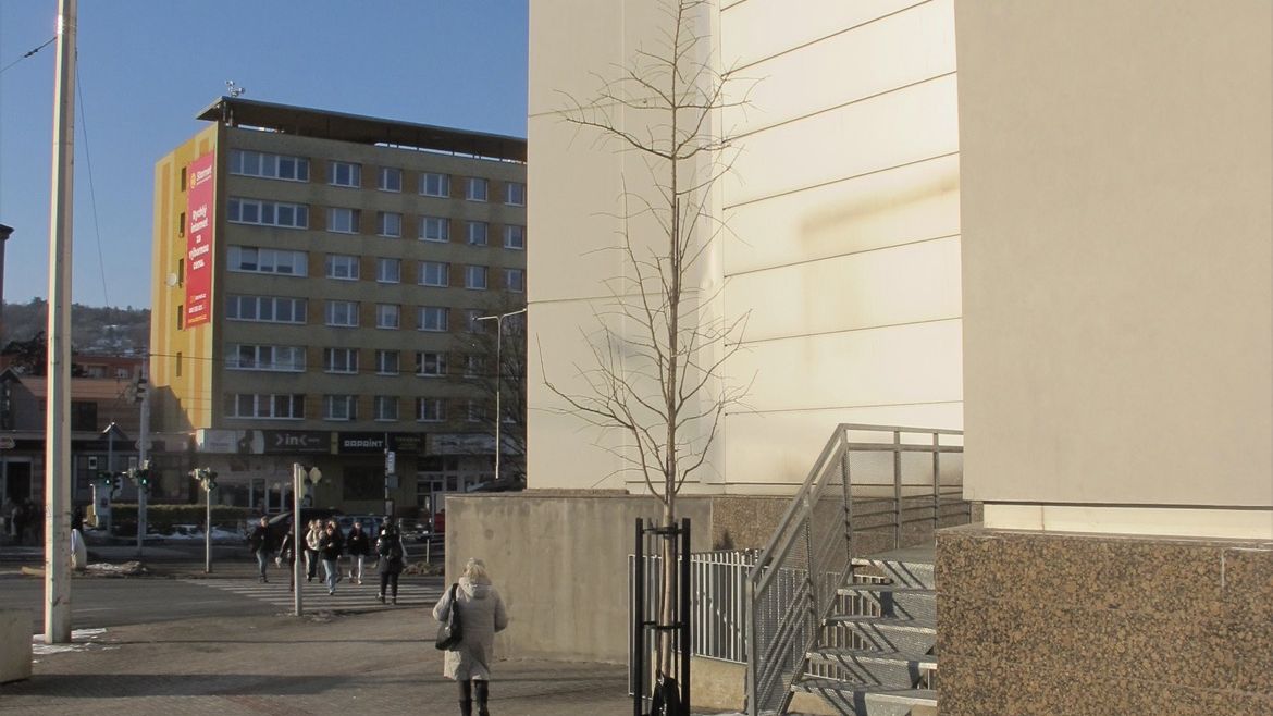 Nová výsadba jinanů u zdi nákupního domu Centrál nerespektuje jejich budoucí rozměry. Ulice po zeleni volá, ale projekty s prostorem zjevně nepočítaly. Náhodně rozmístěná mobilní zeleň pak působí spíš groteskně než funkčně.