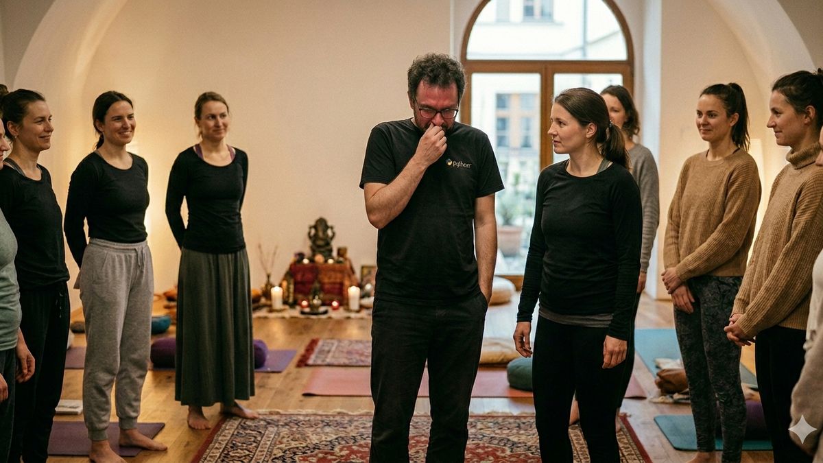 Radan se rozhlédl. Vedle něj stála ambiciózní manažerka z PR agentury, která vypadala, že chce tu tantru „splnit“ na 110 %, a postarší pán v lněných kalhotách, který se nebezpečně kýval do rytmu neexistující hudby. Radan se cítil jako nepodporovaný soubor v operačním systému.