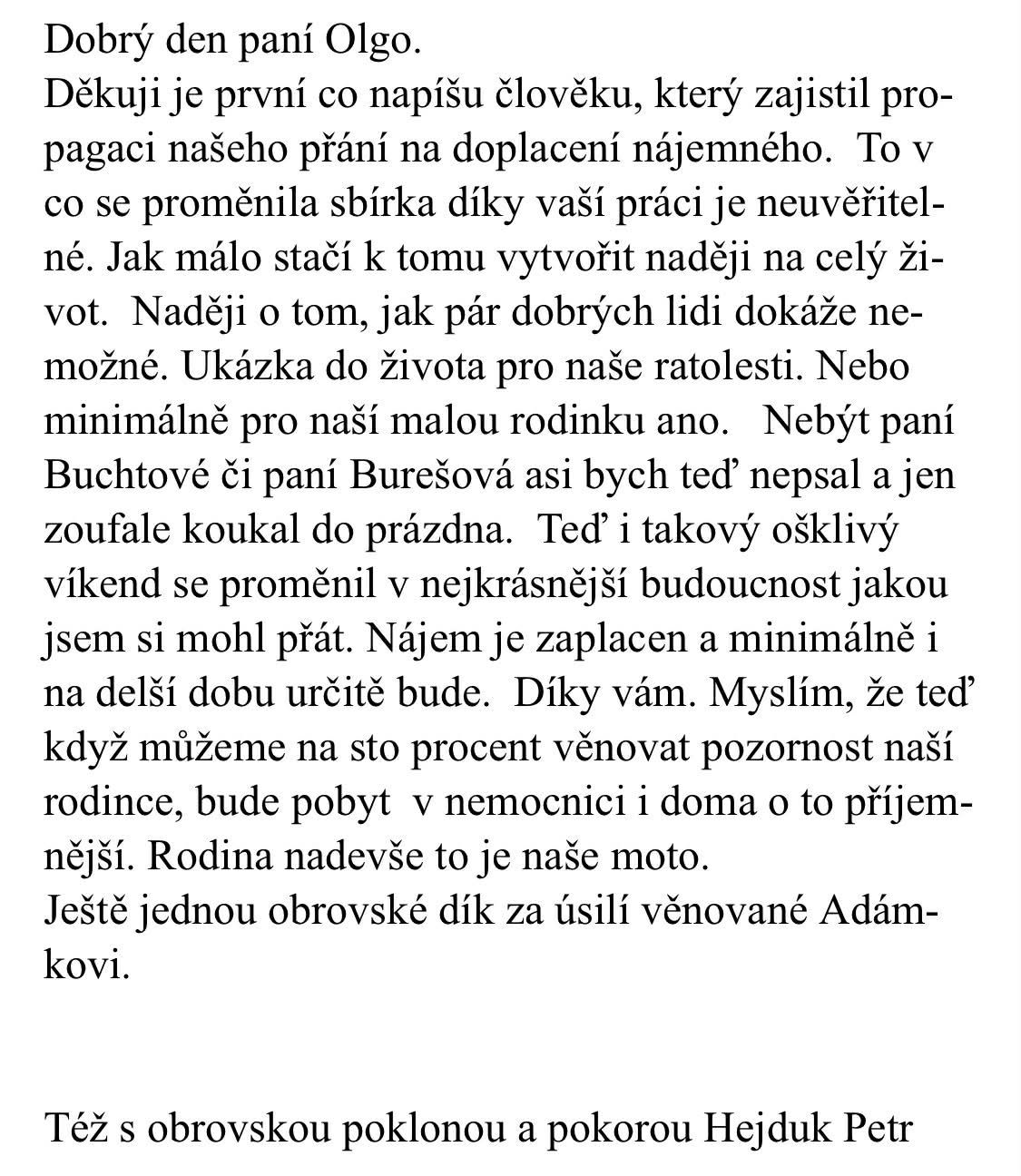 Jeden z posledních dopisů - tento od tatínka onkologicky nemocného syna. Žádal pomoc s jedním nájemným. Zaplatili jste rodině střechu nad hlavou na celý rok. Zajistili jste materiální bezstarostnost, možnost věnovat energii tomu nejdůležitějšímu, co mají.