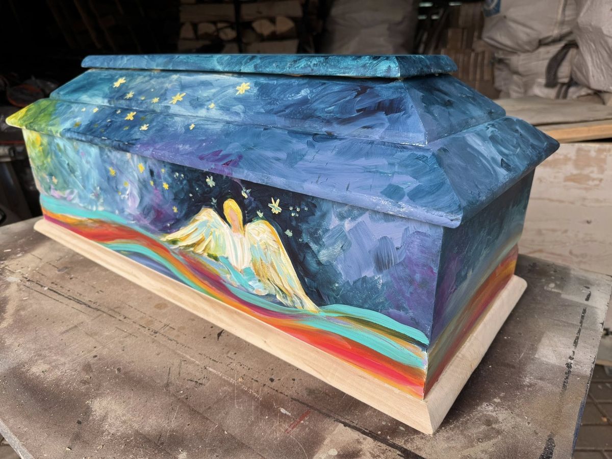„Když někdo, koho milujeme, zemře, svět se rozpadne na kusy. Všechno se změní – čas, prostor, celé naše bytí. A přesto se někde v té prázdnotě rodí potřeba vytvořit něco krásného. Poslat skrze barvu a dotek vzkaz tam, kam už slova nedosáhnou. Malovaná rakev může být tímto vzkazem. Není to jen předmět. Je to dřevo, které nese příběh. O životě, který byl prožit. O lásce, co stále proudí. Každý tah štětce, symbol a odstín barvy může nést vzpomínku, ozvěnu toho, co člověk na tomto světě miloval. Můžeme malovat sami. Můžeme pozvat přátele, kteří mají cit, ruce od barvy a srdce otevřené. A možná i zesnulého znali. Můžeme dovolit tvořivosti, aby se stala naším průvodcem. Vzít si čas a prostor a proměnit ho v tvořivý rituál loučení. Protože všechno, co v té posvátné době mezi smrtí a pohřbem vzniká z lásky, má hlubokou léčivou sílu. Prostřednictvím našich rukou se naše srdce učí nést vše, co to znamená ztratit. Pomáhá dotknout se tajemství smrti a dát mu tvar, který nese i krásu,“ vysvětlují své poslání umělkyně.