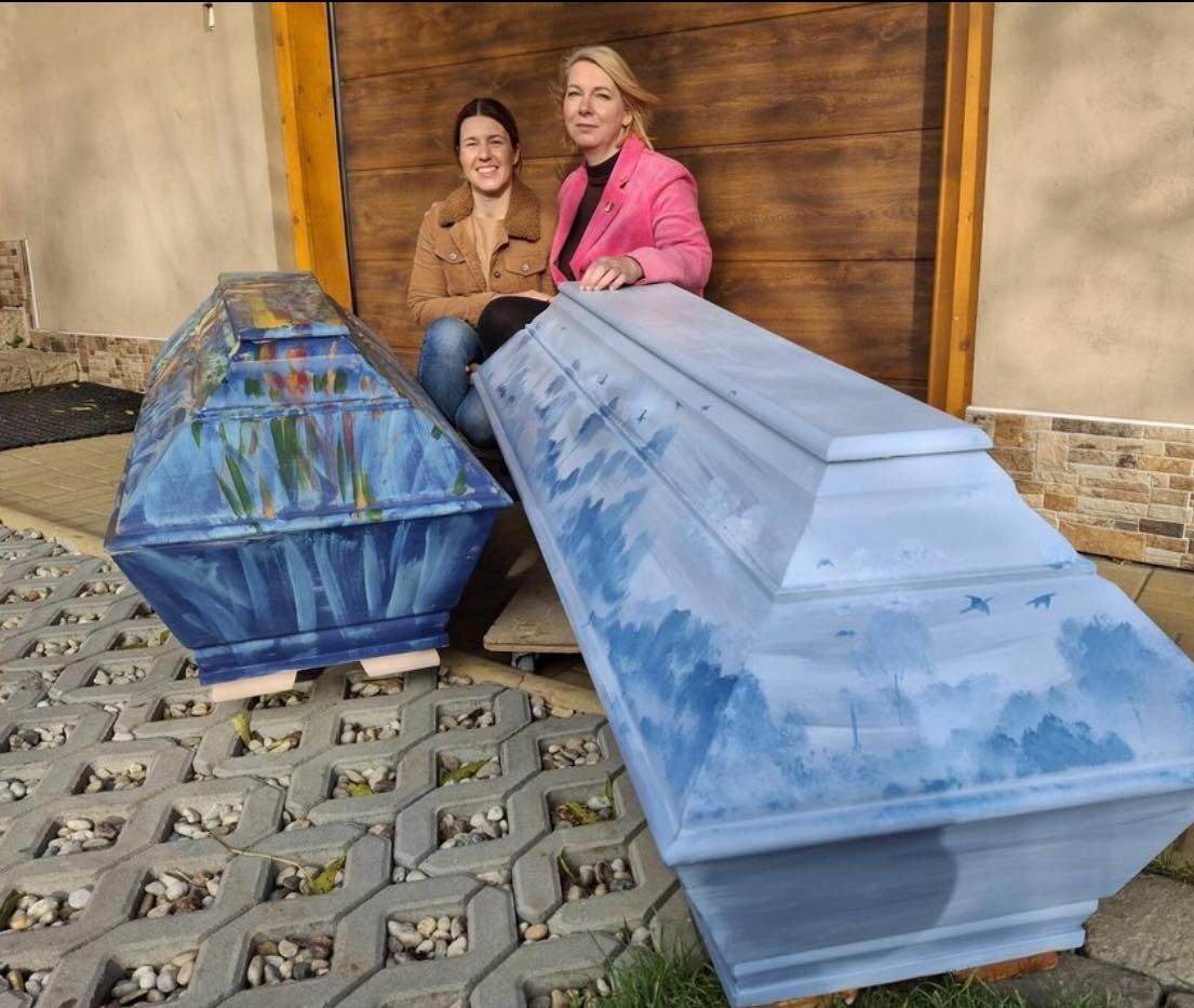 Miroslava Kosečková a Markéta Pešková jsou výtvarnice, kamarádky a spolupracovnice. Miroslava se věnuje malování, řezbářství a mozaice, Markéta maluje obrazy inspirované přírodou a její vášní je také umělecká malba nábytku. Svůj talent a kreativitu spojily v projektu s názvem Malovaná rakev po té, co jednoho dne u kuchyňského stolu zabředly do tématu krize, války a smrti. Tam to všechno začalo, v teoretické rovině, vše ale umocnil osobní prožitek Markéty při pohřbu milované babičky - v klasicky černém ladění. Věděla, že tak by si to její babičky nepřála. A tak se zrodil projekt, který dává příležitost dopřát každému odcházení, jaké by si přál. A rodině možnost rozloučit se tak, aby to zanechalo o něco barevnější vzpomínky na odchod.