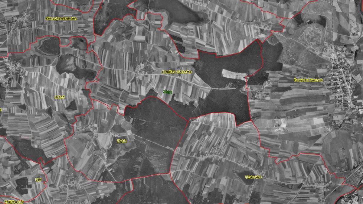 Celý Branišovský les Bor (Budějcká i Branišovská část) před stavbou sídliště Máj v Českých Budějovicích. Letecký pohled 1952