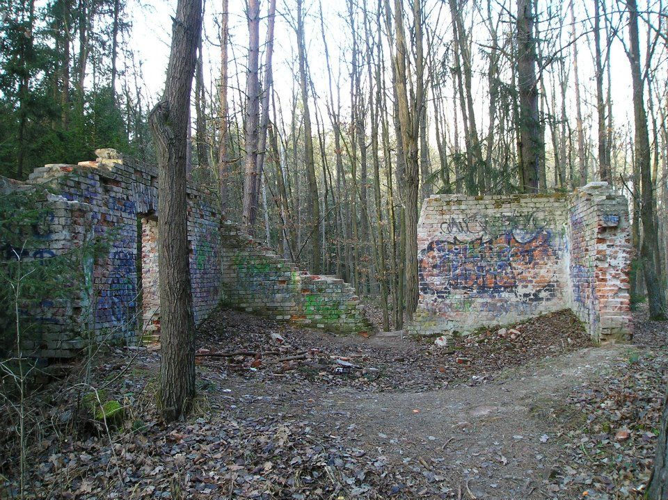 Zbytek terčového zařízení v Budějovické části lesa Bor. V ruinách po bývalé střelnici.