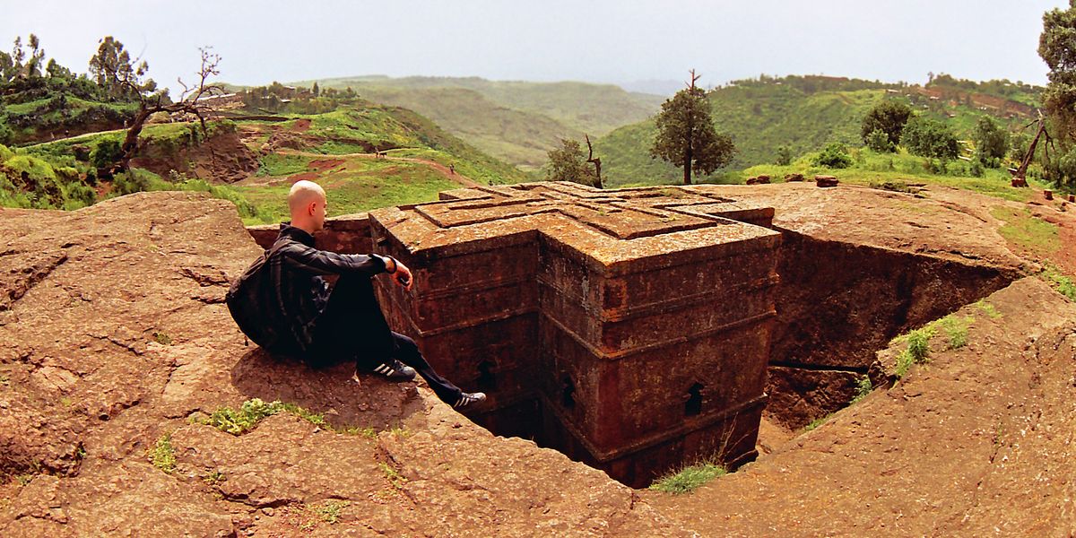 Autor článku u kostela sv. Jiří zahloubeného do skalního podloží v Lalibele, Etiopie