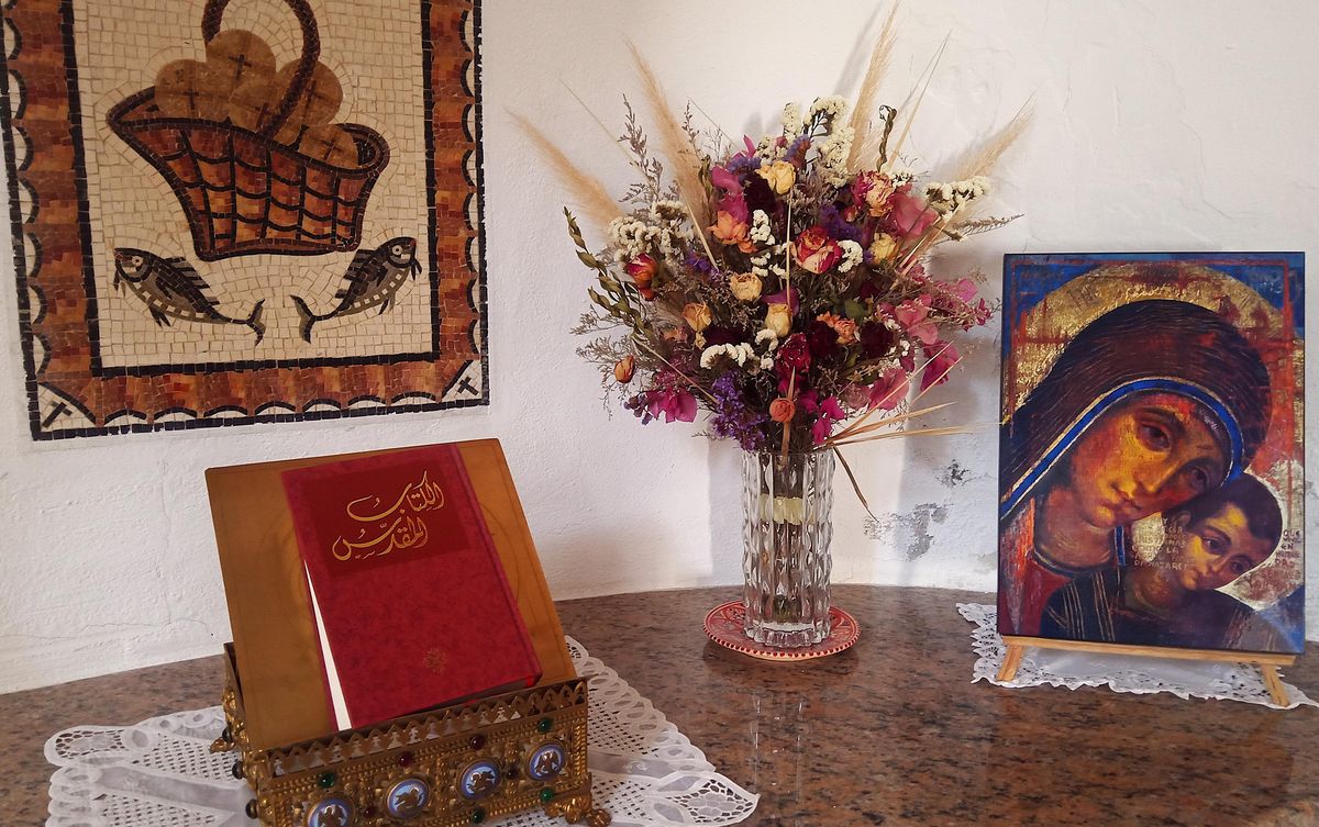Severoafrický křesťanský oltář s ikonou Panny Marie s Ježíšem a Biblí v arabštině