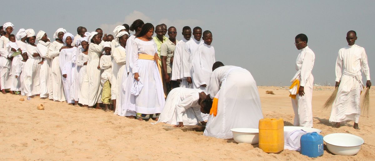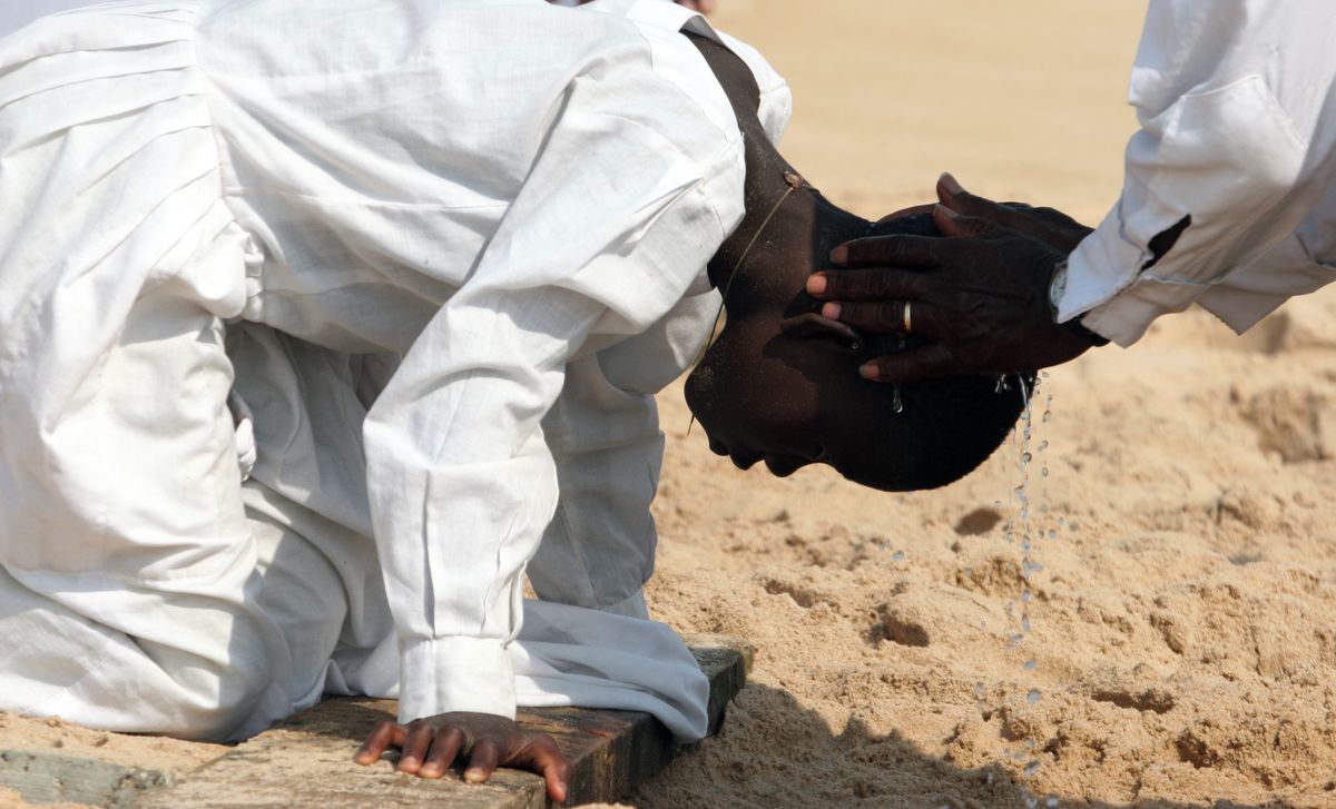 Kněz Nebeské církve Kristovy křtí na beninské pláži