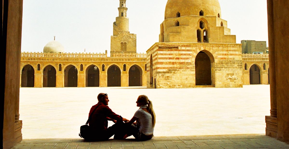 Autor s manželkou v káhirské Íbn Tulúnově mešitě, která je jednou z nejstarších a nejdůležitějších mešit v Egyptě. Byla vystavěná mezi lety 876 a 879 abbásovským místodržícím Íbn Tulúnem v architektonickém stylu iráckých mešit včetně typického spirálového minaretu