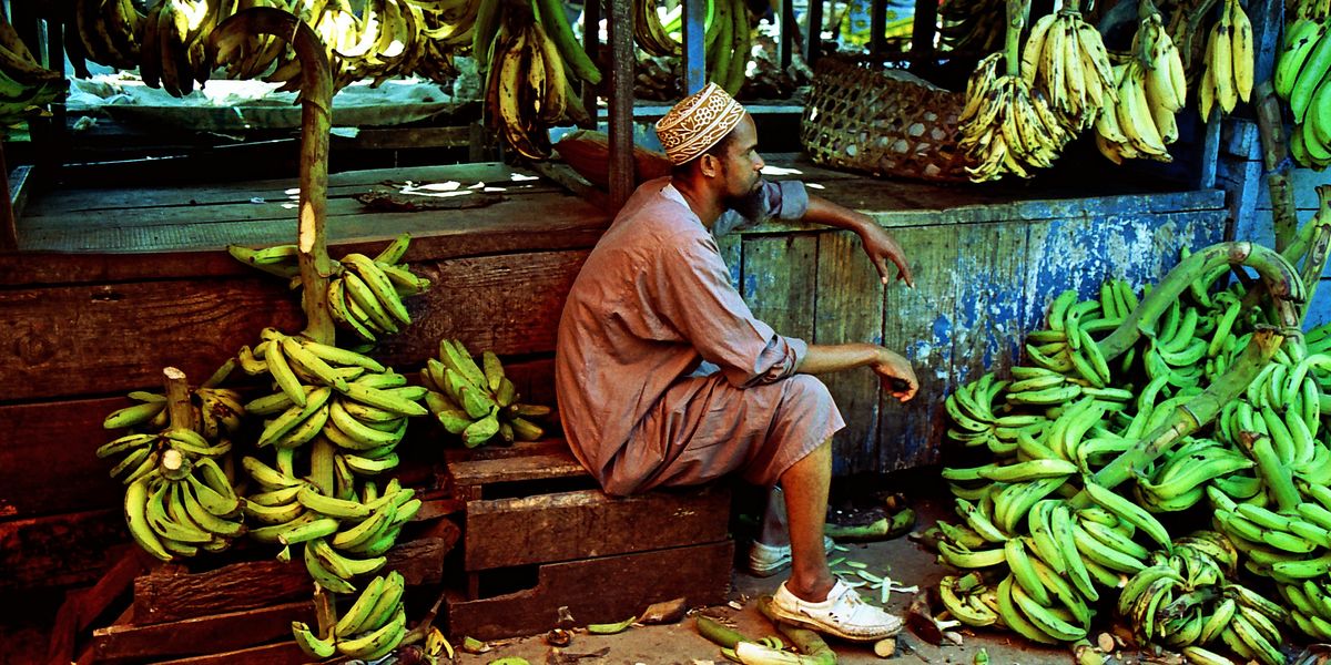 Zanzibarský muslim prodává banány na tržišti ve městě Stone Town. Dva měsíce jsme zde studovali tradiční náboženství a na tomto trhu denně nakupovali potraviny