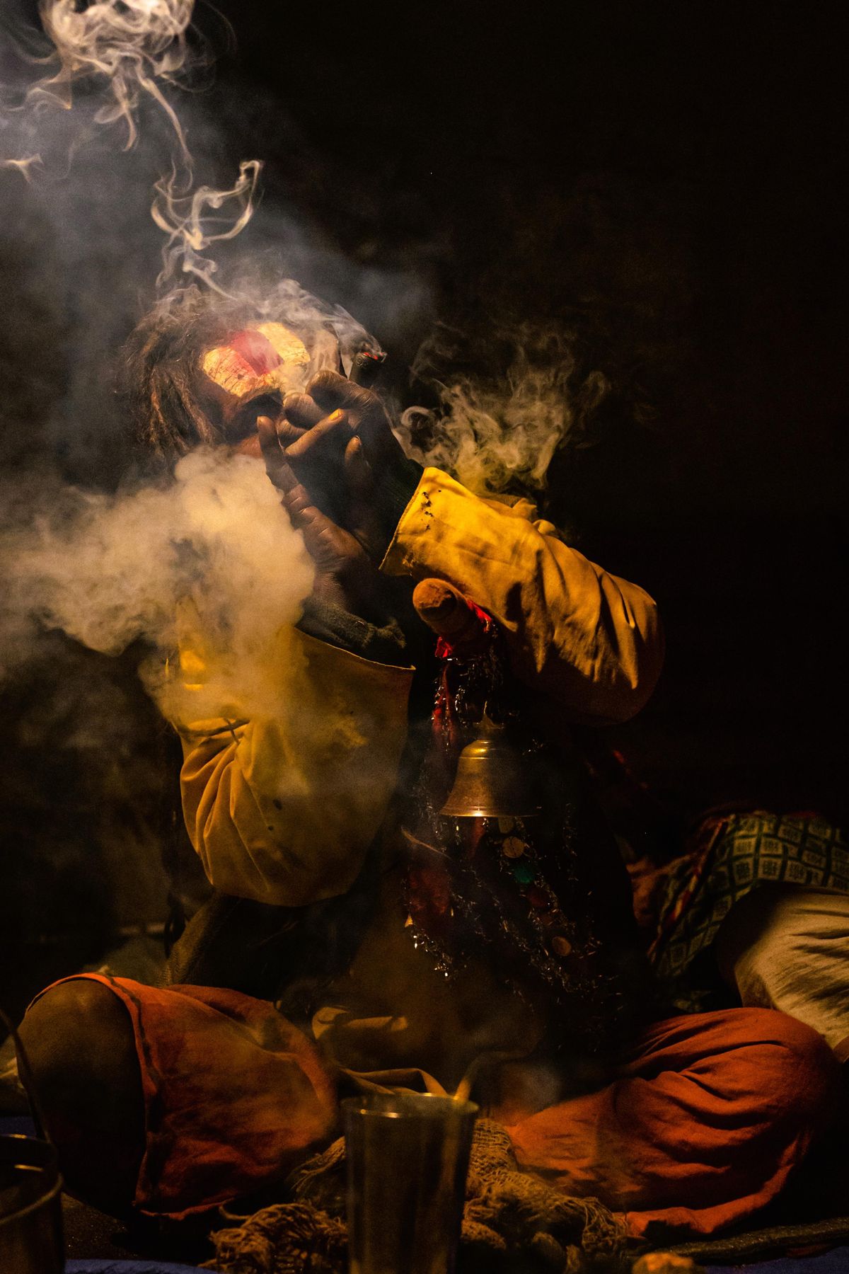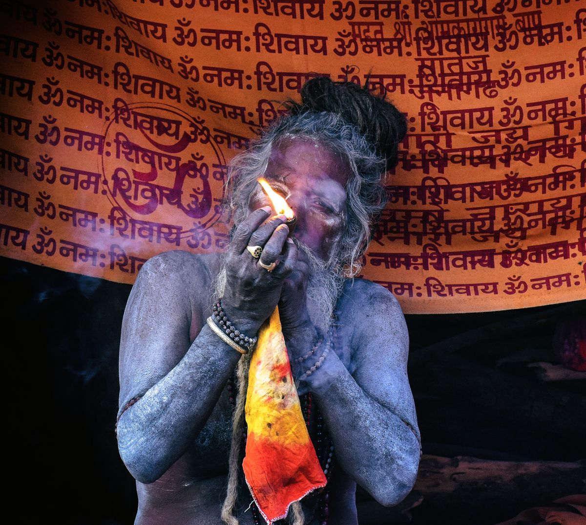 Sádhu kouří „Šivovy dredy“ ze svého obřadního čilumu