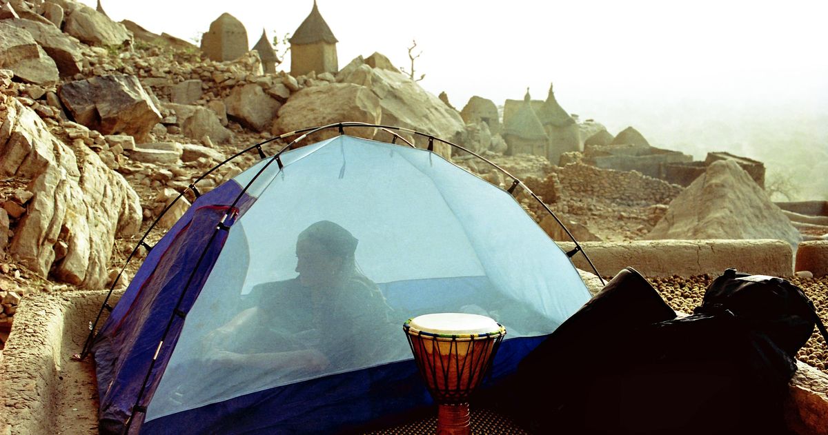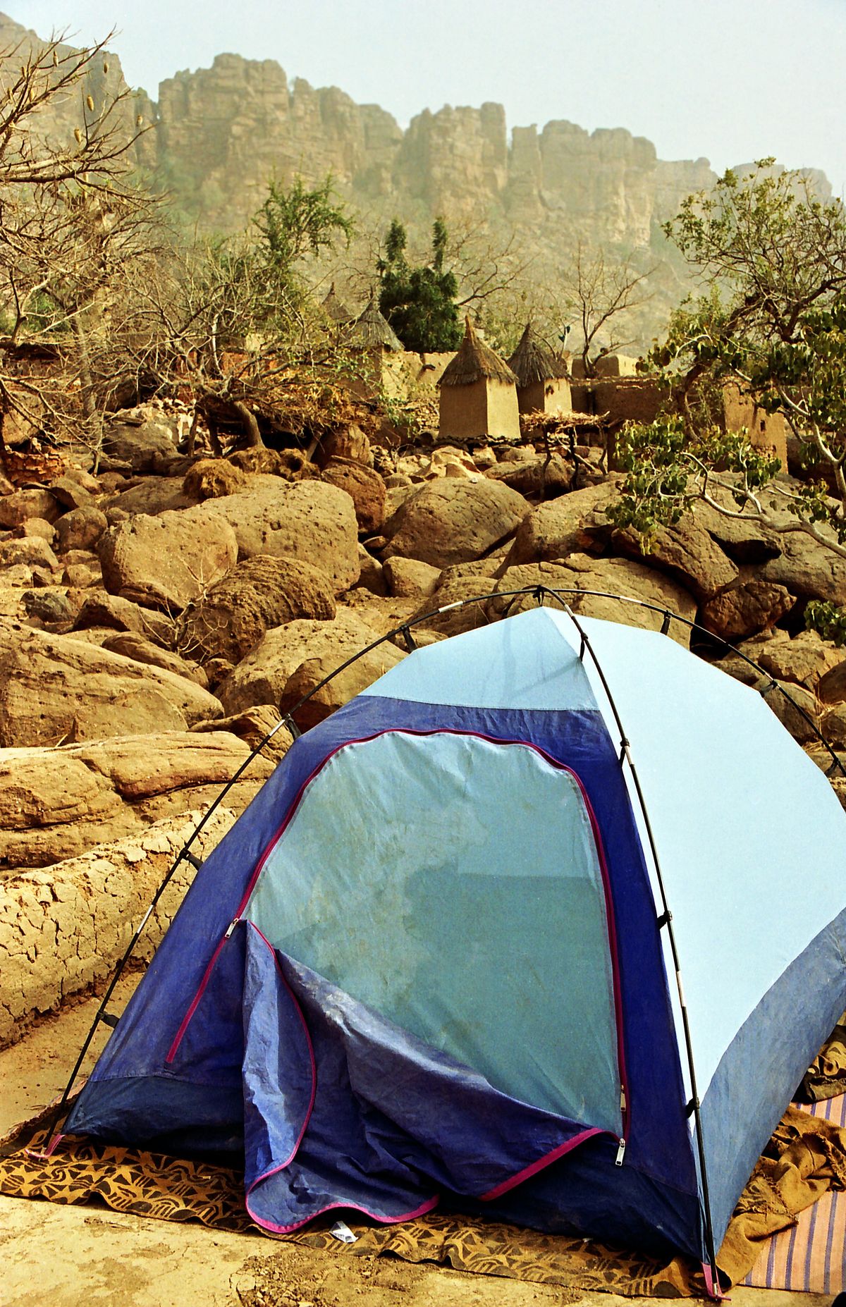 Naše moskytiéra na okraji dogonské vesnice pod útesem Bandiagara