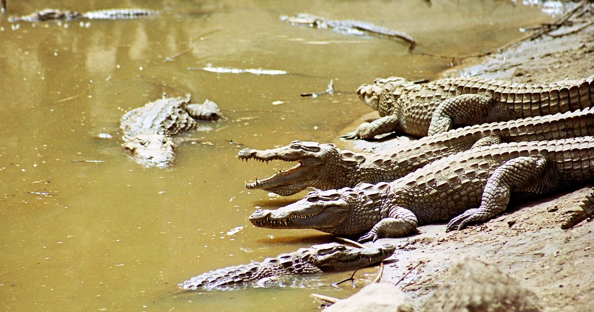 Krokodýli v posvátném jezírku pod útesem Bandiagara
