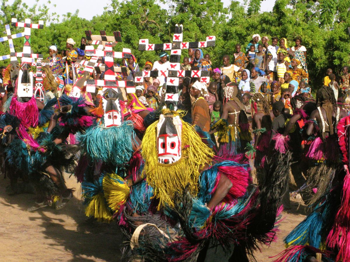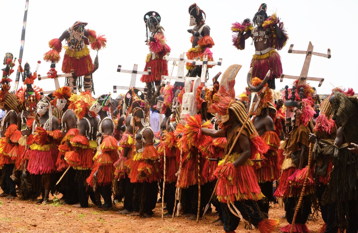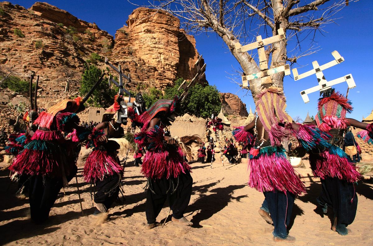 Dogoni v obřadních maskách při náboženském festivalu