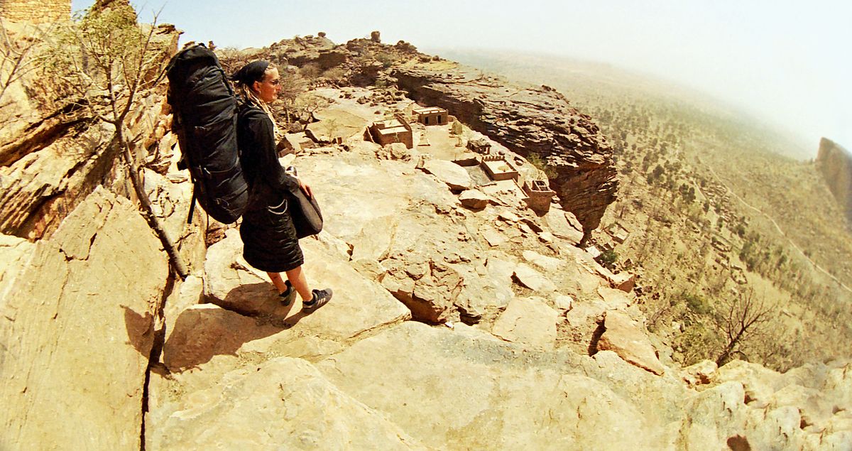 Na horní hraně útesu Bandiagara. Útes je možné na několika místech ve skalních rozsedlinách sejít. Mali