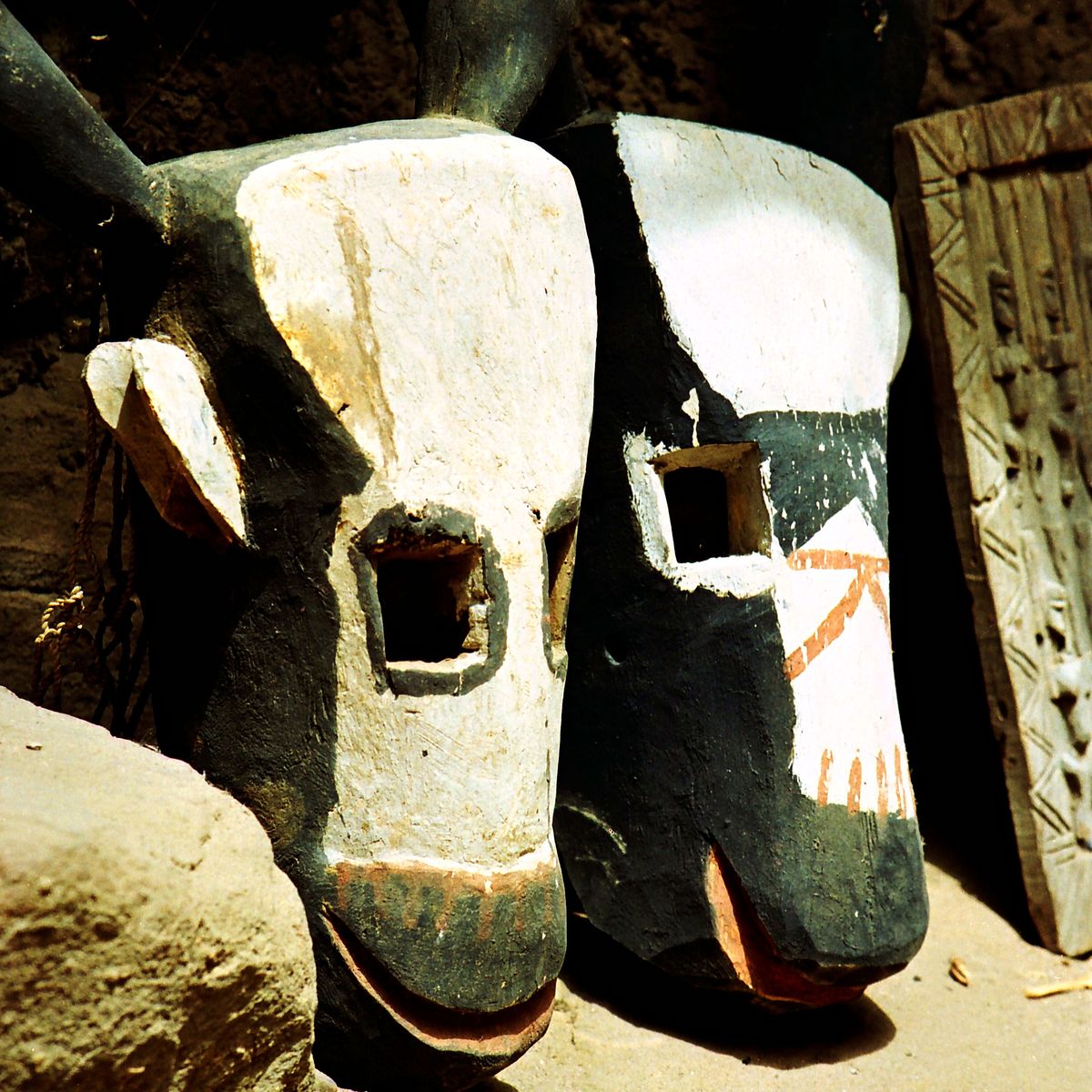Podoba platí i v oblasti obřadních masek a využívání rytmických nástrojů k dosahování rituálního transu, přestože dogonské masky jsou vzhledem k běžně používaným maskám okolních etnik či náboženských směrů unikátní. Jistou podobu lze vysledovat s maskami u některých etnik v Burkině Faso. Bubny jsou stejné nebo velmi podobné a odlišné rytmy vzhledem k okolí jsem mezi Dogony také nezaznamenal.