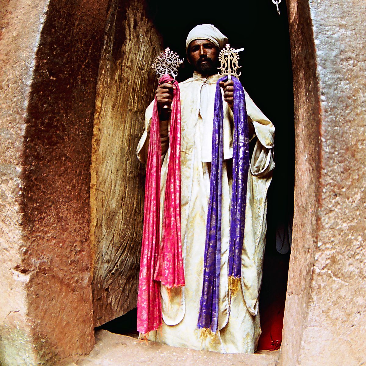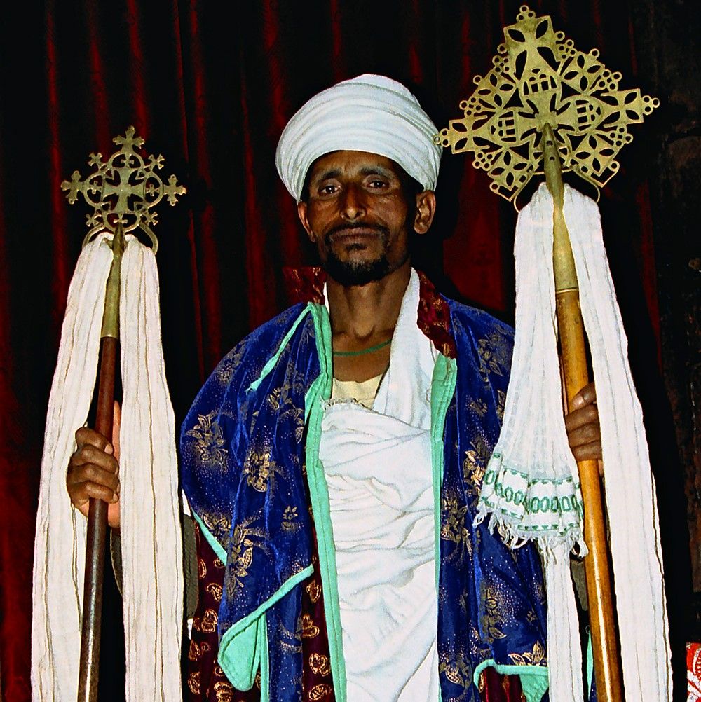 Kněz etiopské pravoslavné církve v jednom z kostelů Lalibely