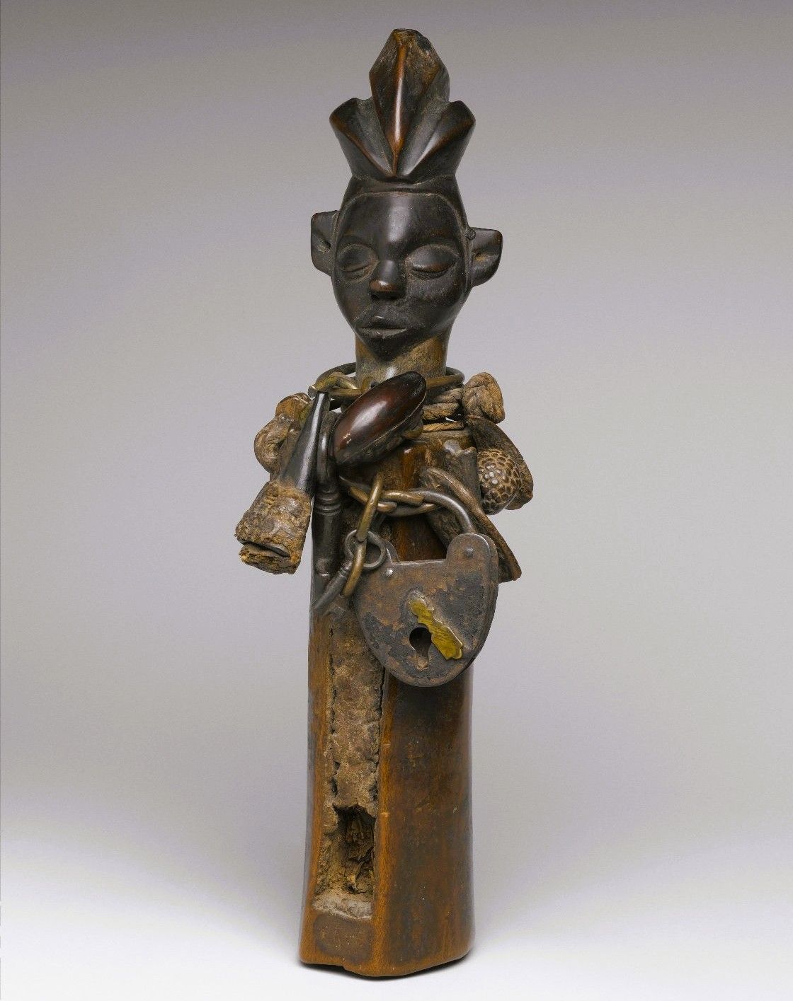 Malý štěrbinový buben ve tvaru člověka s ochrannými přívěsky