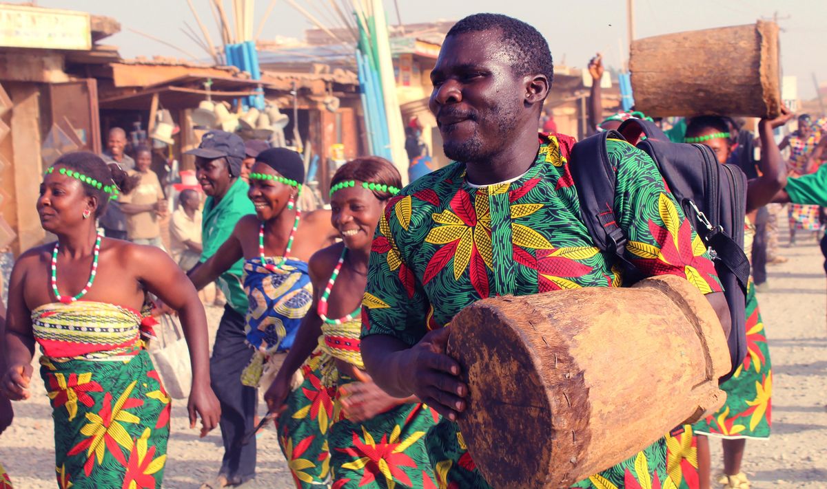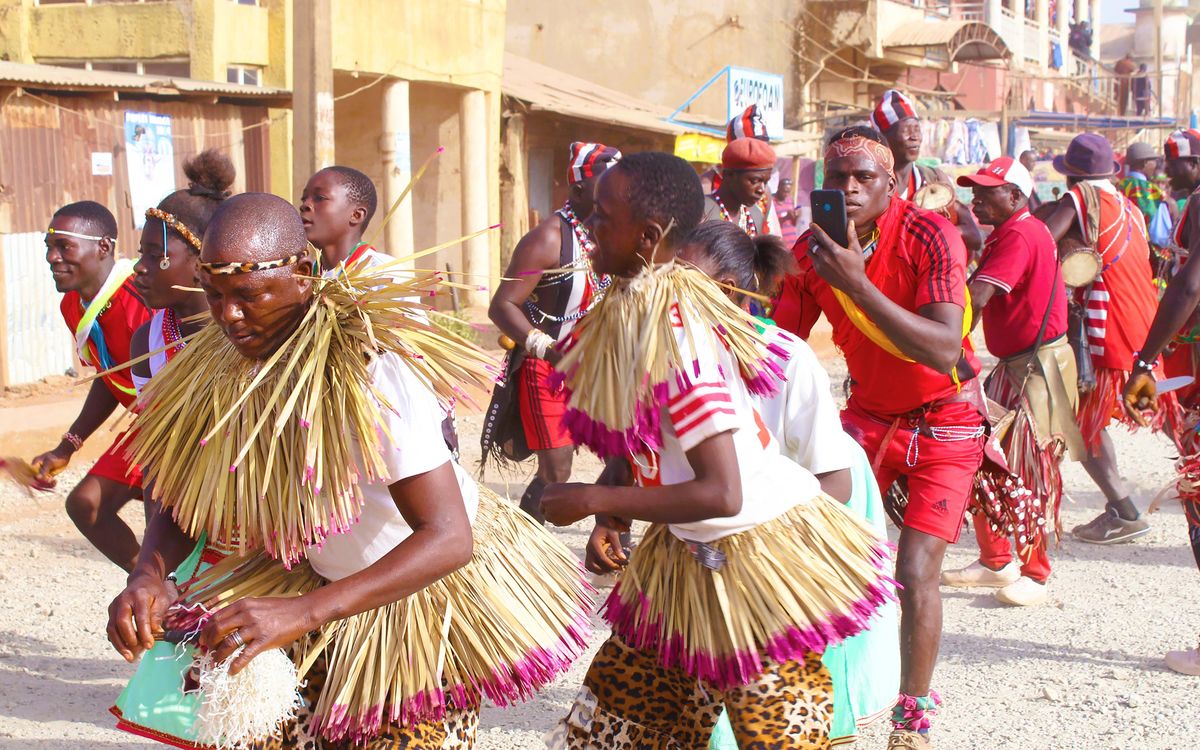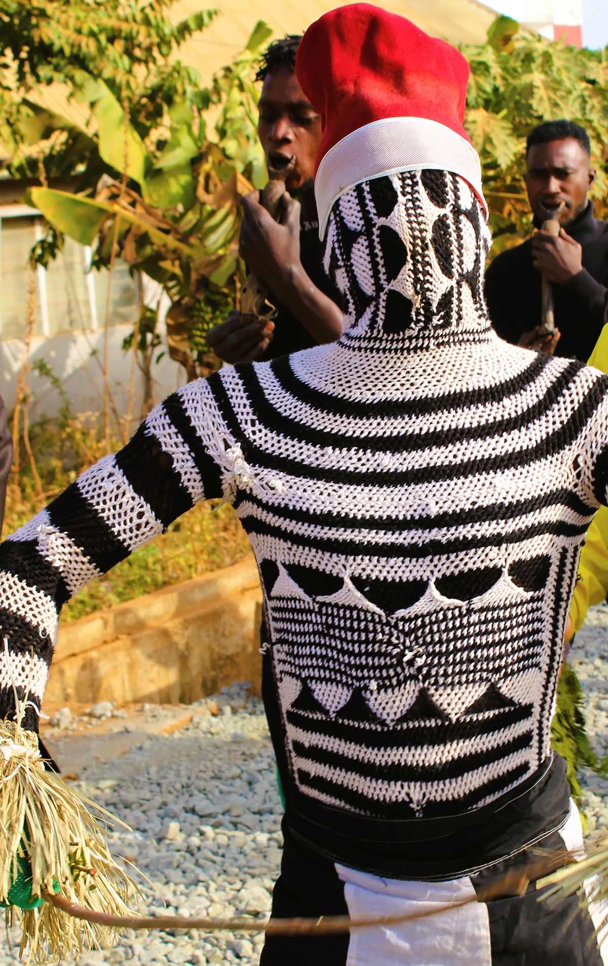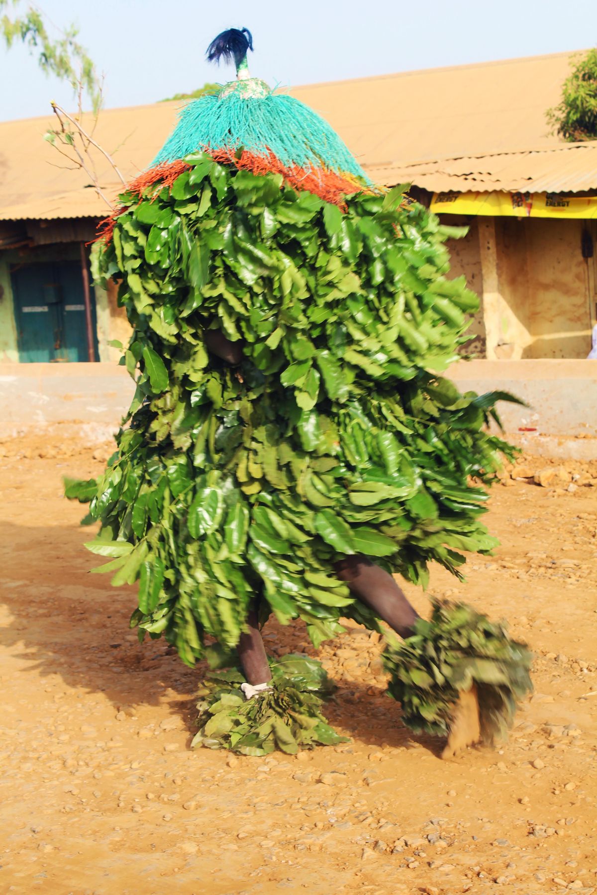 Tradiční středonigerijská maska. V pozadí muži s příručními imitátory hlasu předků