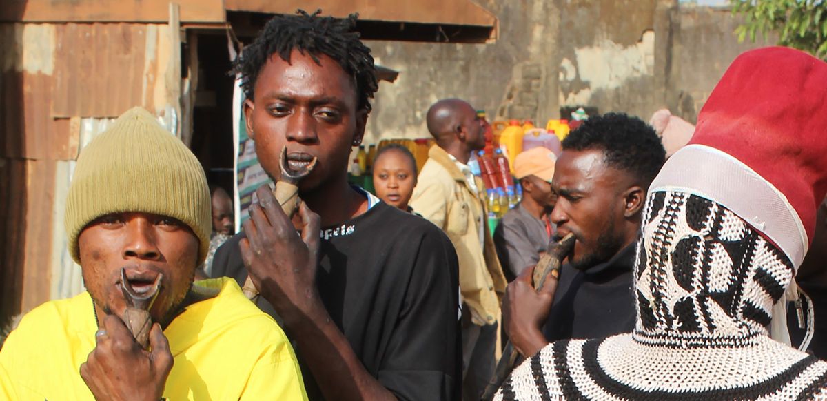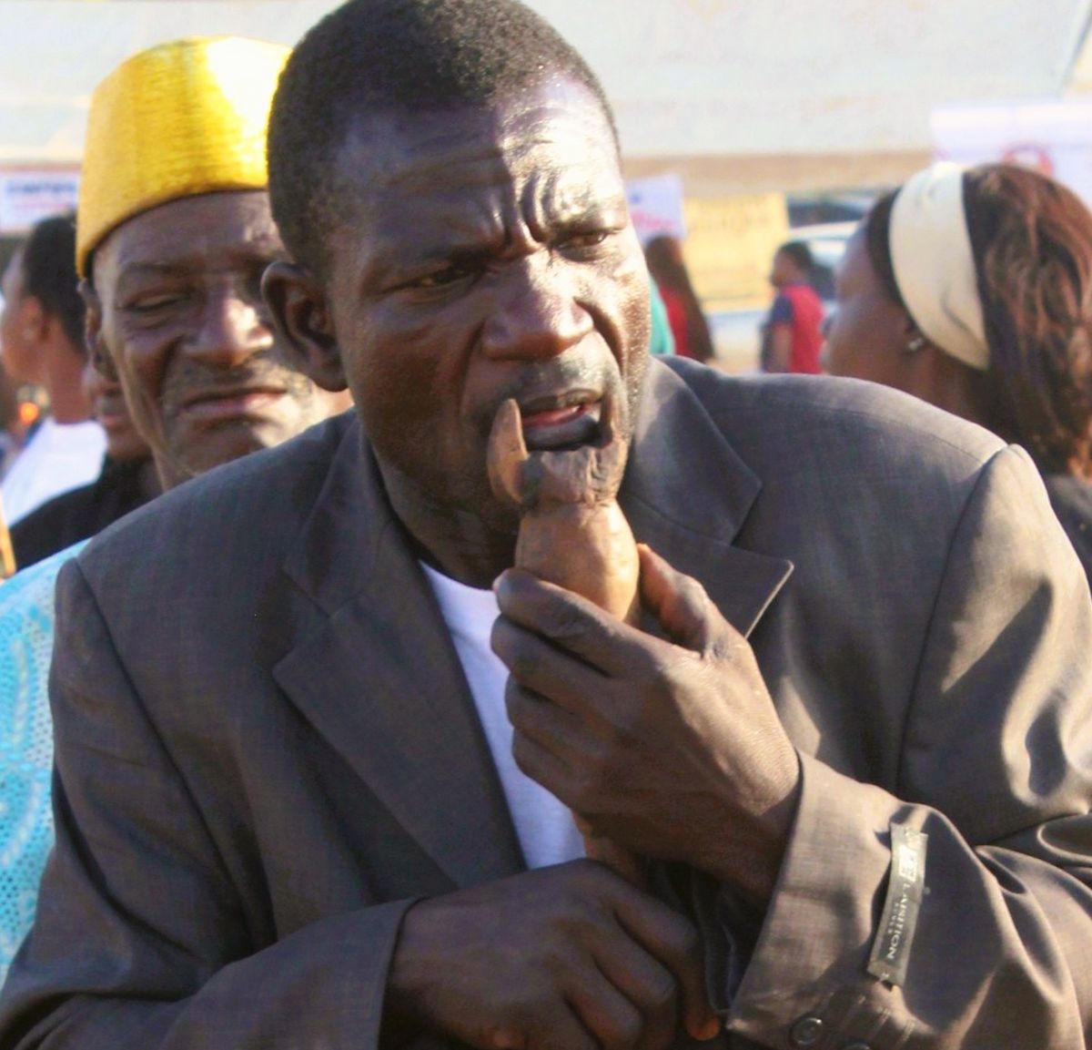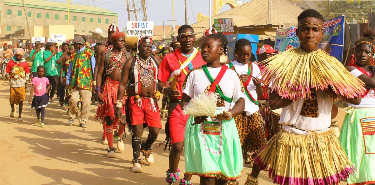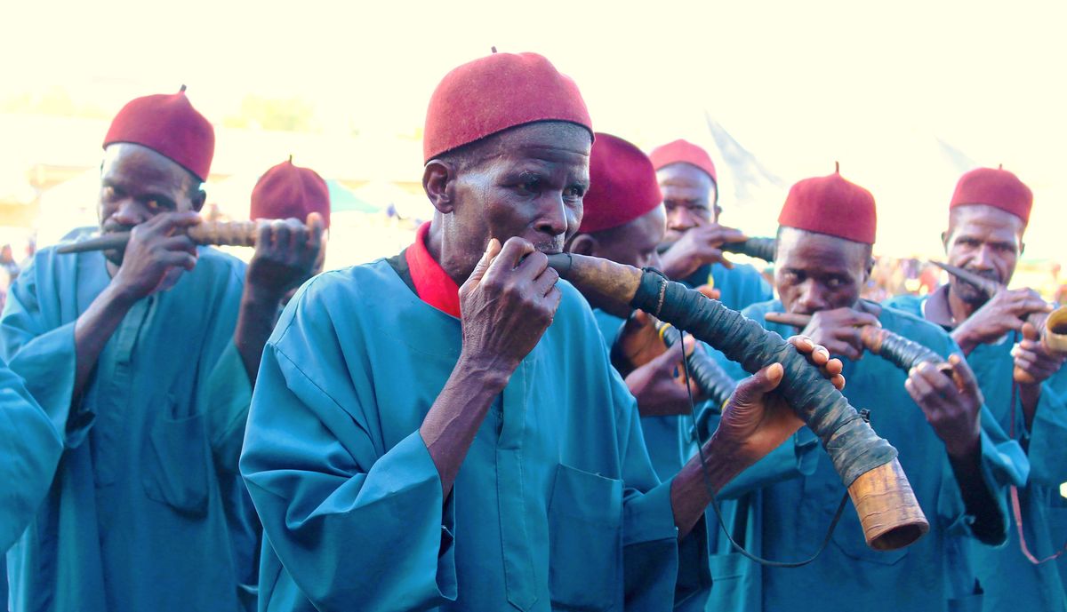Tradiční středonigerijská maska. V pozadí muži s příručními imitátory hlasu předků