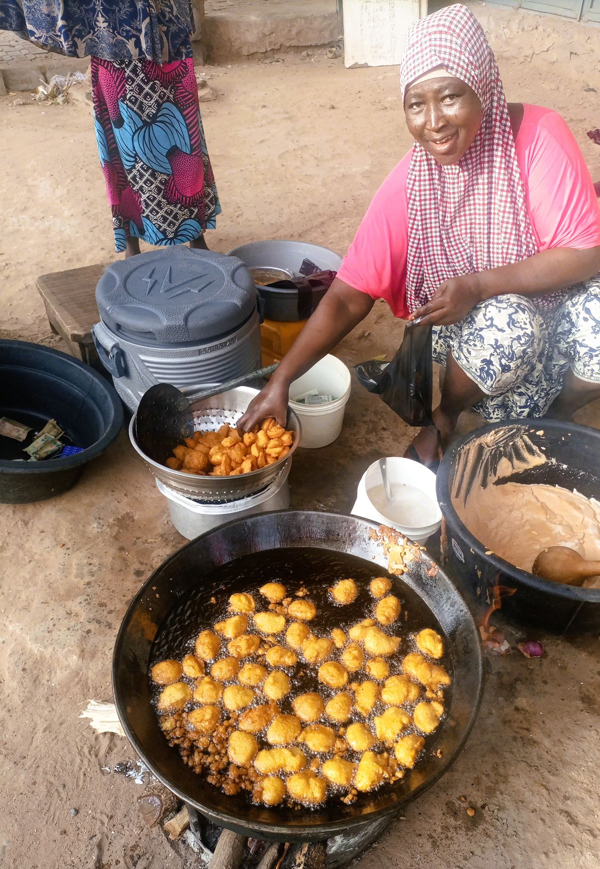 Žena připravuje a na ulici rovnou prodává nigerské kosai