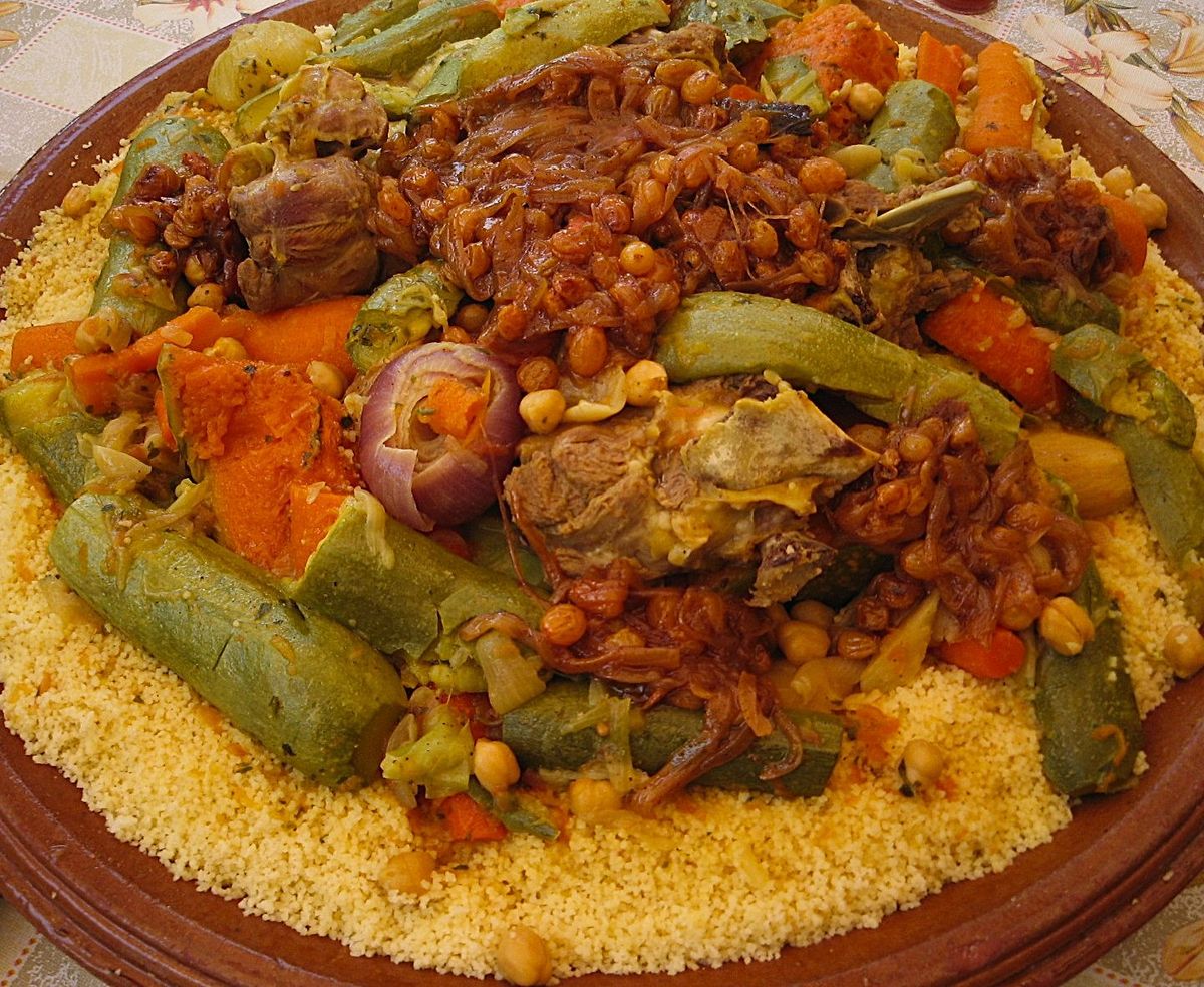 Kuskus servírovaný se zeleninou, masem a sladkou omáčkou tfaya. Maroko