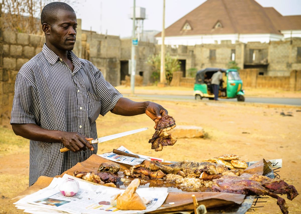 Donedávna bylo běžnou nabídkou maso z krokodýla, dnes už je spíše výjimkou. Sloní maso je v současné Africe pro cizince spíše unikátem než dostupným pokrmem, podobně i opičí. Antilopa nebo prase bradavičnaté je rozhodně dostupnější – nejrozšířenější maso je kuřecí a hovězí.