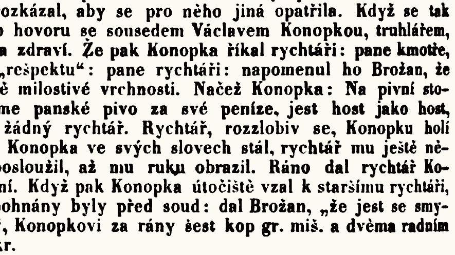 A když Konopka ve svých slovech stál, rychtář mu ještě některou ranou posloužil, až mu ruku obrazil.