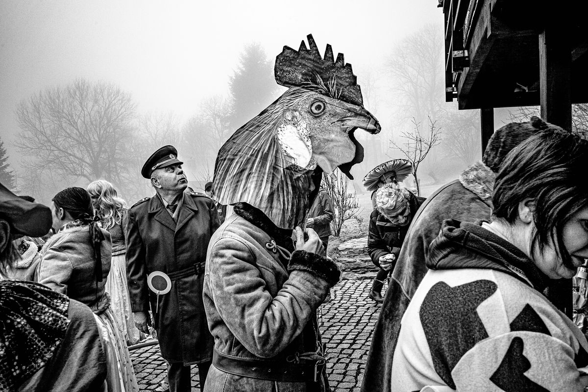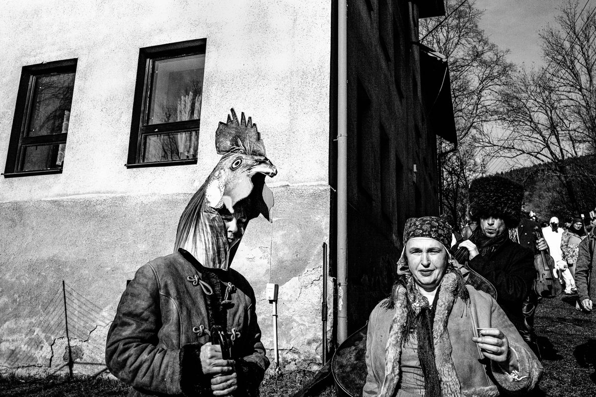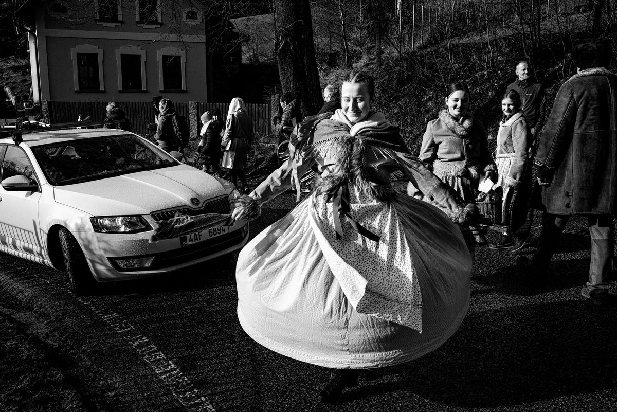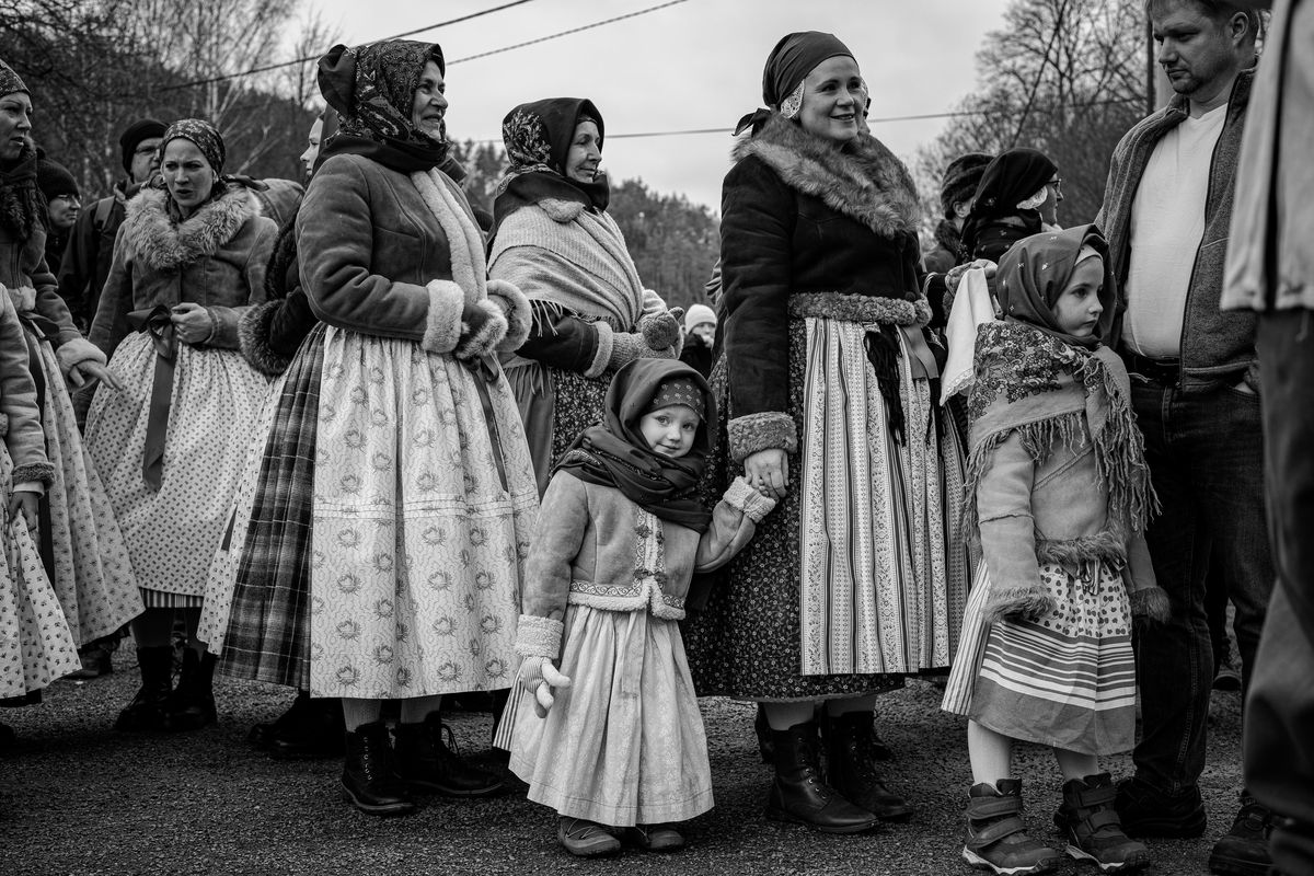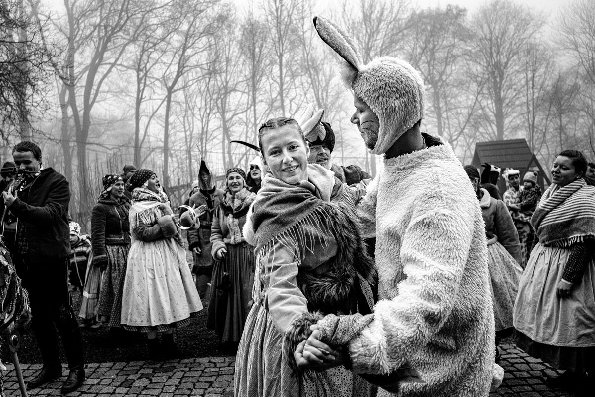 Už třetím rokem na severu Čech dokumentuji masopustní průvody, které se od ostatních výrazně liší. V Podještědí, na opačné straně Ještědského hřbetu od Liberce, se v malých horských vesnicích v posledních letech probudila k životu stará tradice. Stejně jako ve východních částech naší země se i zde nosily kroje a zpívaly místní lidové písně. Tento malebný, pomalu zapomínaný kraj Karolíny Světlé znovu ožívá díky spolku Dubáci a folklornímu souboru Horačky, kteří tradici navracejí její původní podobu.