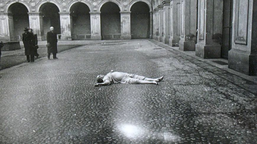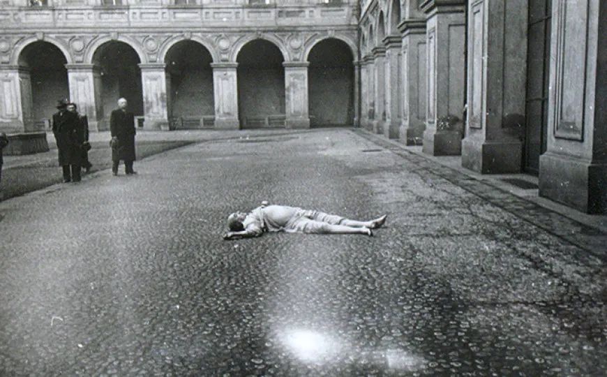 Fotografie zesnulého Jana Masaryka na místě činu, pod okny jeho koupelny.